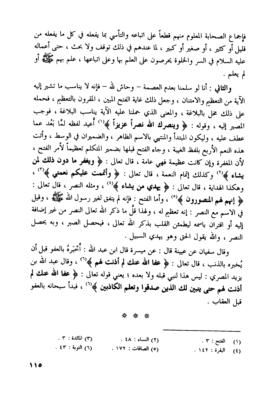 والثاني: أنا لو سلمنا بعدم العصمة- وحاش للَّه- فإنه لا يناسب ما تشير إليه الآية من التعظيم والامتنان، وجعل ذلك غاية الفتح المبين، المقرون بالتعظيم، فحمله على ذلك مخل بالبلاغة، والمعنى الّذي حملنا عليه الآية يناسب البلاغة، فوجب المصير إليه، وقوله: وَيَنْصُرَكَ اللَّهُ نَصْراً عَزِيزاً [ (1) ] أعيد لفظه لمّا بعد عما عطف عليه، وليكون المبتدأ والمنتهي بالاسم الظاهر، والضميران في الوسط، وأتت هذه النعم الأربع بلفظ الغيبة، وجاء الفتح قبلها بضمير المتكلم تعظيما لأمر الفتح، لأن المغفرة وإن كانت عظيمة فهي عامة، قال تعالى: وَيَغْفِرُ ما دُونَ ذلِكَ لِمَنْ يَشاءُ [ (2) ] وكذلك إتمام النعمة، قال تعالى: وَأَتْمَمْتُ عَلَيْكُمْ نِعْمَتِي [ (3) ] ، وهكذا الهداية، قال تعالى: يَهْدِي مَنْ يَشاءُ [ (4) ] ، ومثله النصر، قال تعالى: