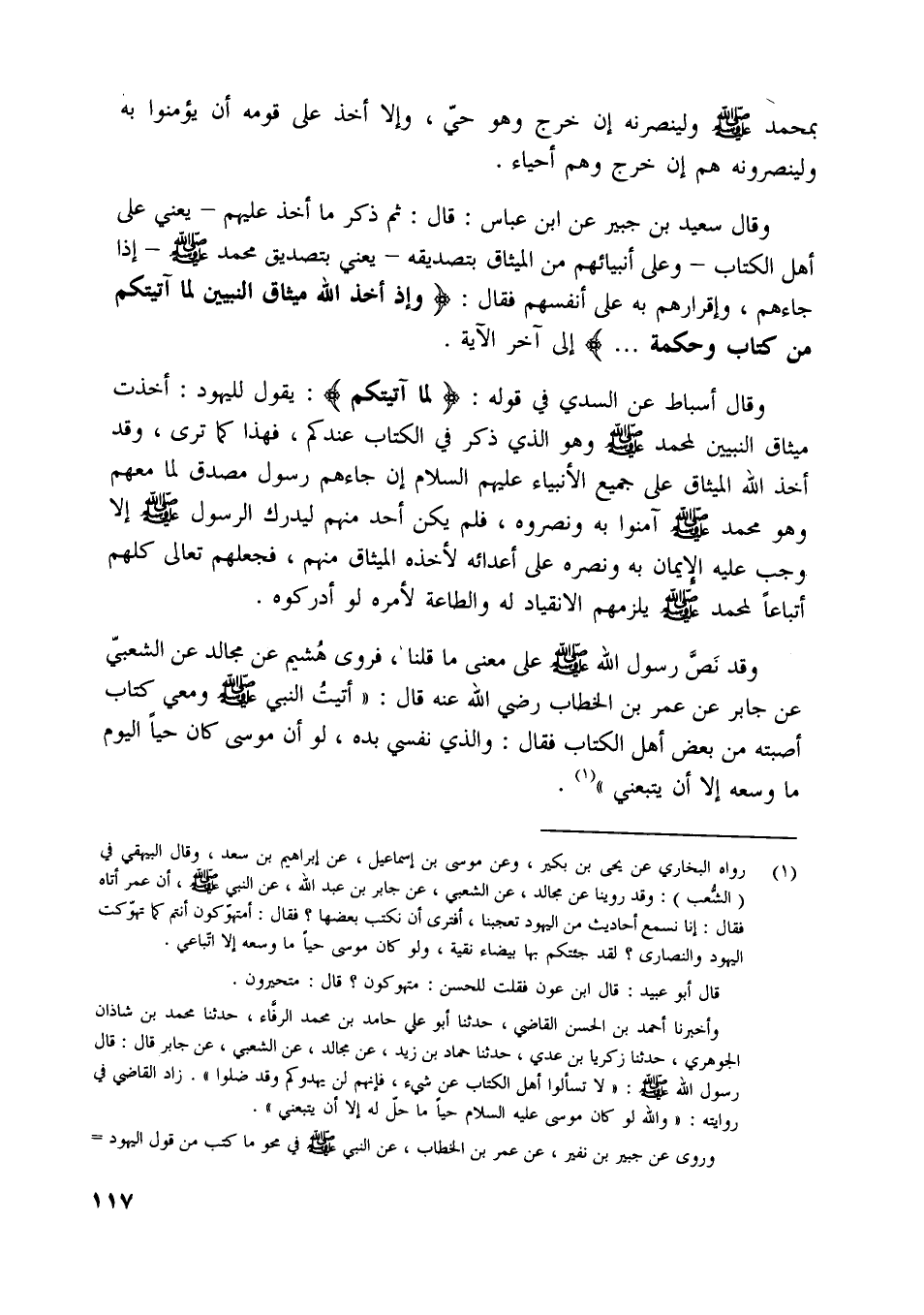 فروى هشيم عن مجالد عن الشعبيّ عن جابر عن عمر بن الخطاب رضي اللَّه عنه قال: «أتيت النبي صلى اللَّه عليه وسلّم ومعي كتاب أصبته من بعض أهل الكتاب فقال: والّذي نفسي بيده، لو أن موسى كان حيا اليوم ما وسعه إلا أن يتبعني» [ (1) ] .