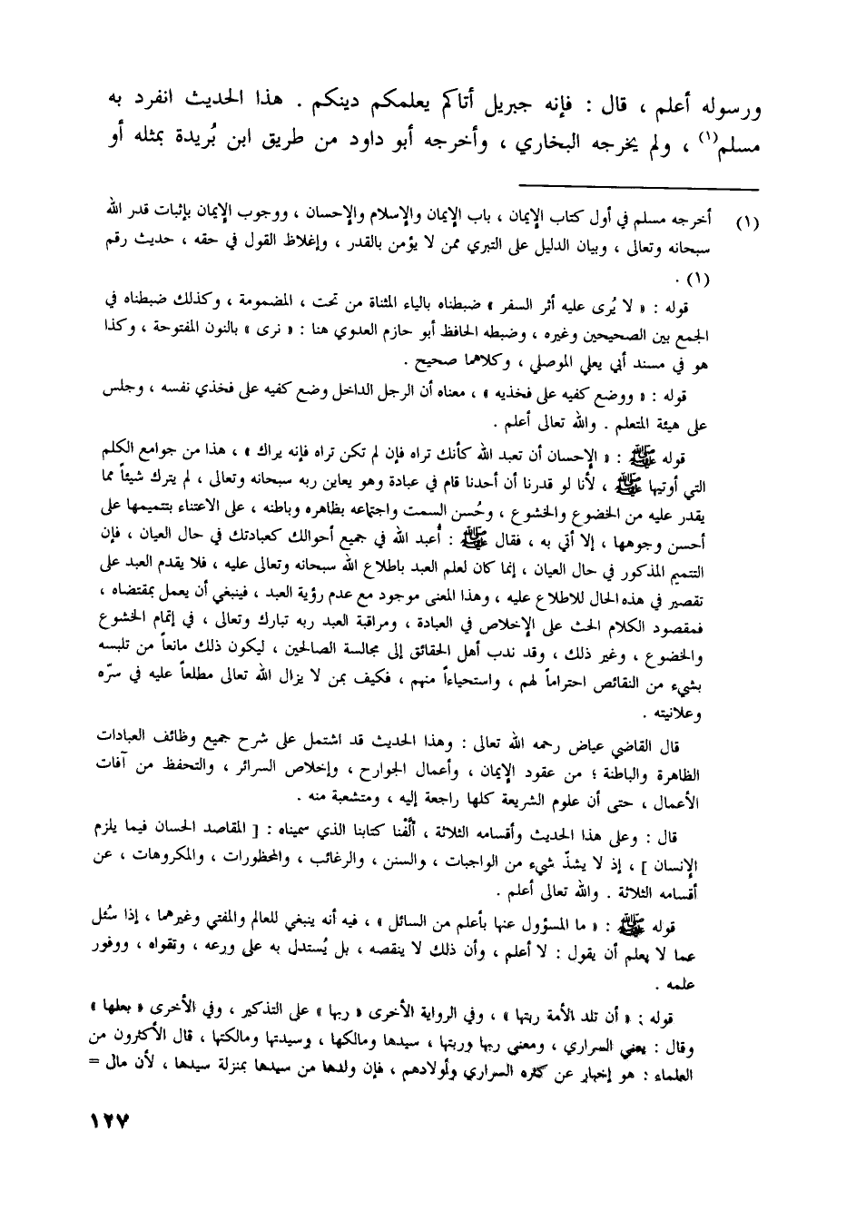 [ (1) ] أخرجه مسلم في أول كتاب الإيمان، باب الإيمان والإسلام والإحسان، ووجوب الإيمان بإثبات قدر اللَّه سبحانه وتعالى، وبيان الدليل على التبري ممن لا يؤمن بالقدر، وإغلاظ القول في حقه، حديث رقم (1) .