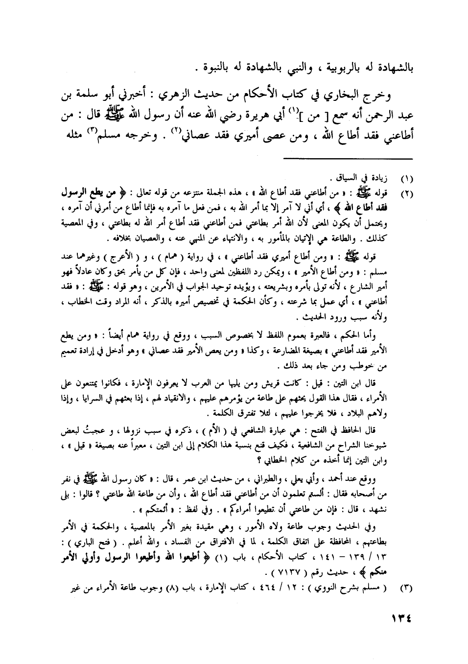 وخرج البخاري في كتاب الأحكام من حديث الزهري: أخبرني أبو سلمة بن عبد الرحمن أنه سمع [من] [ (1) ] أبي هريرة رضي اللَّه عنه أن رسول اللَّه صلى اللَّه عليه وسلّم قال: من أطاعني فقد أطاع اللَّه، ومن عصى أميري فقد عصاني [ (2) ] . وخرجه مسلم [ (3) ] مثله