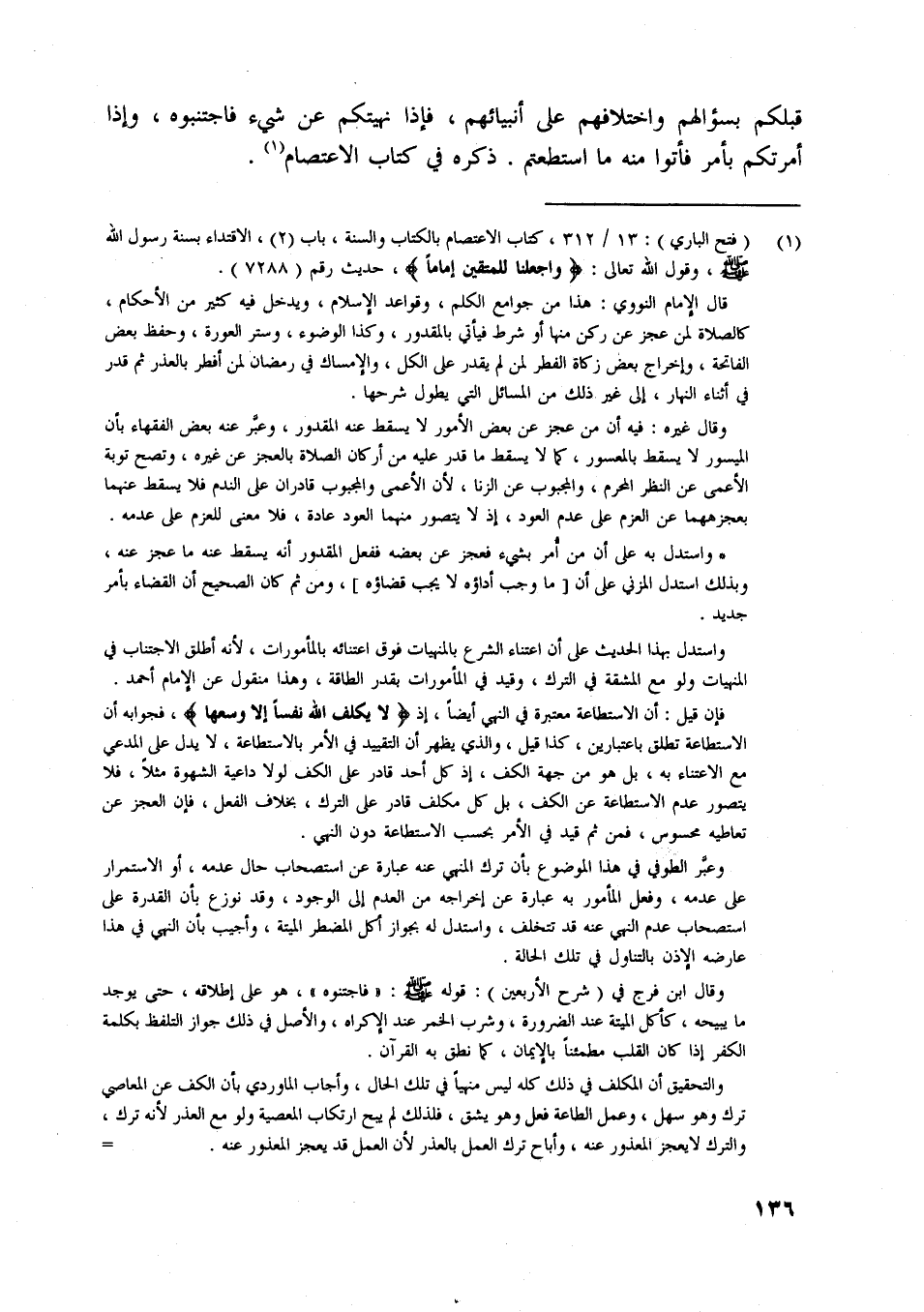 قبلكم بسؤالهم واختلافهم على أنبيائهم، فإذا نهيتكم عن شيء فاجتنبوه، وإذا أمرتكم بأمر فأتوا منه ما استطعتم. ذكره في كتاب الاعتصام [ (1) ] .
