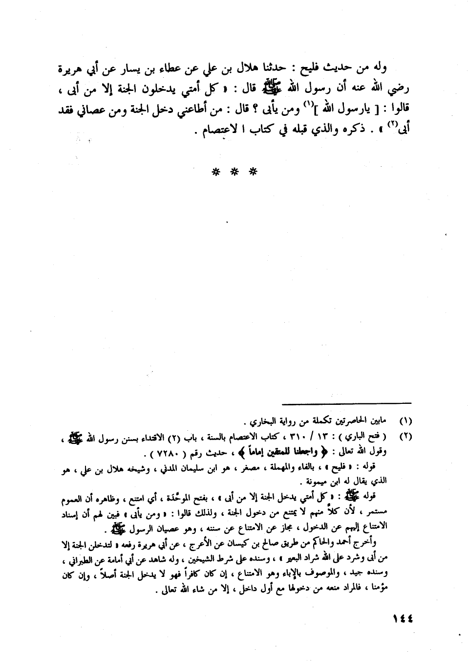 وله من حديث فليح: حدثنا هلال بن علي عن عطاء بن يسار عن أبي هريرة رضي اللَّه عنه أن رسول اللَّه صلى اللَّه عليه وسلّم قال: «كل أمتي يدخلون الجنة إلا من أبي، قالوا: [يا رسول اللَّه] [ (1) ] ومن يأبى؟ قال: من أطاعني دخل الجنة ومن عصاني فقد أبي [ (2) ] » . ذكره والّذي قبله في كتاب الاعتصام.