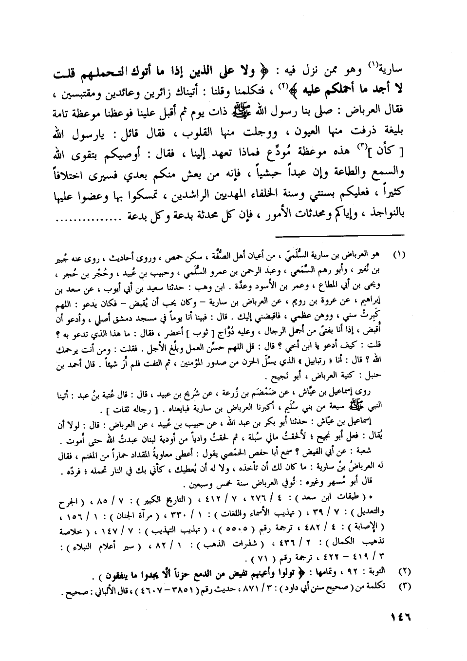سارية [ (1) ] وهو ممن نزل فيه: وَلا عَلَى الَّذِينَ إِذا ما أَتَوْكَ لِتَحْمِلَهُمْ قُلْتَ لا أَجِدُ ما أَحْمِلُكُمْ عَلَيْهِ [ (2) ] ، فتكلمنا وقلنا: أتيناك زائرين وعائدين ومقتبسين، فقال العرباض: صلى بنا رسول اللَّه صلى اللَّه عليه وسلّم ذات يوم ثم أقبل علينا فوعظنا موعظة تامة بليغة ذرفت منها العيون، ووجلت منها القلوب، فقال قائل: يا رسول اللَّه [كأن] [ (3) ] هذه موعظة مودّع فماذا تعهد إلينا، فقال: أوصيكم بتقوى اللَّه والسمع والطاعة وإن عبدا حبشيا، فإنه من يعش منكم بعدي فسيرى اختلافا كثيرا، فعليكم بسنتي وسنة الخلفاء المهديين الراشدين، تمسكوا بها وعضوا عليها بالنواجذ، وإياكم ومحدثات الأمور، فإن كل محدثة بدعة وكل بدعة ...