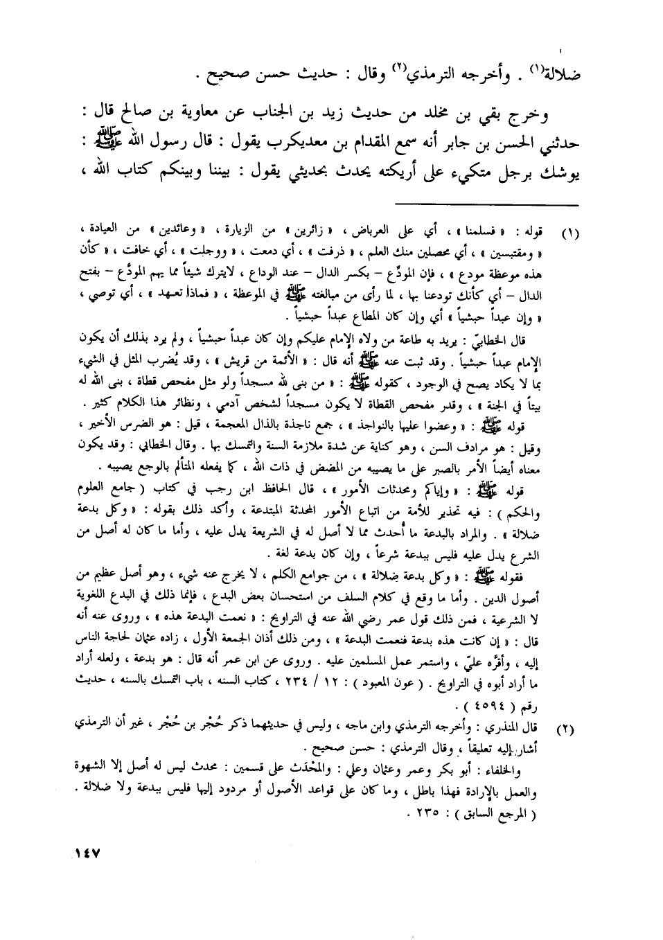 [ (1) ] قوله: «فسلمنا» ، أي على العرباض، «زائرين» من الزيارة، «وعائدين» من العيادة، «ومقتبسين» ، أي محصلين منك العلم، «ذرفت» ، أي دمعت، «ووجلت» ، أي خافت، «كأن هذه موعظة مودع» ، فإن المودّع- بكسر الدال- عند الوداع، لا يترك شيئا مما يهم المودّع- بفتح الدال- أي كأنك تودعنا بها، لما رأى من مبالغته صلى اللَّه عليه وسلّم في الموعظة، «فماذا تعهد» ، أي توصي، «وإن عبدا حبشيا» أي وإن كان المطاع عبدا حبشيا.