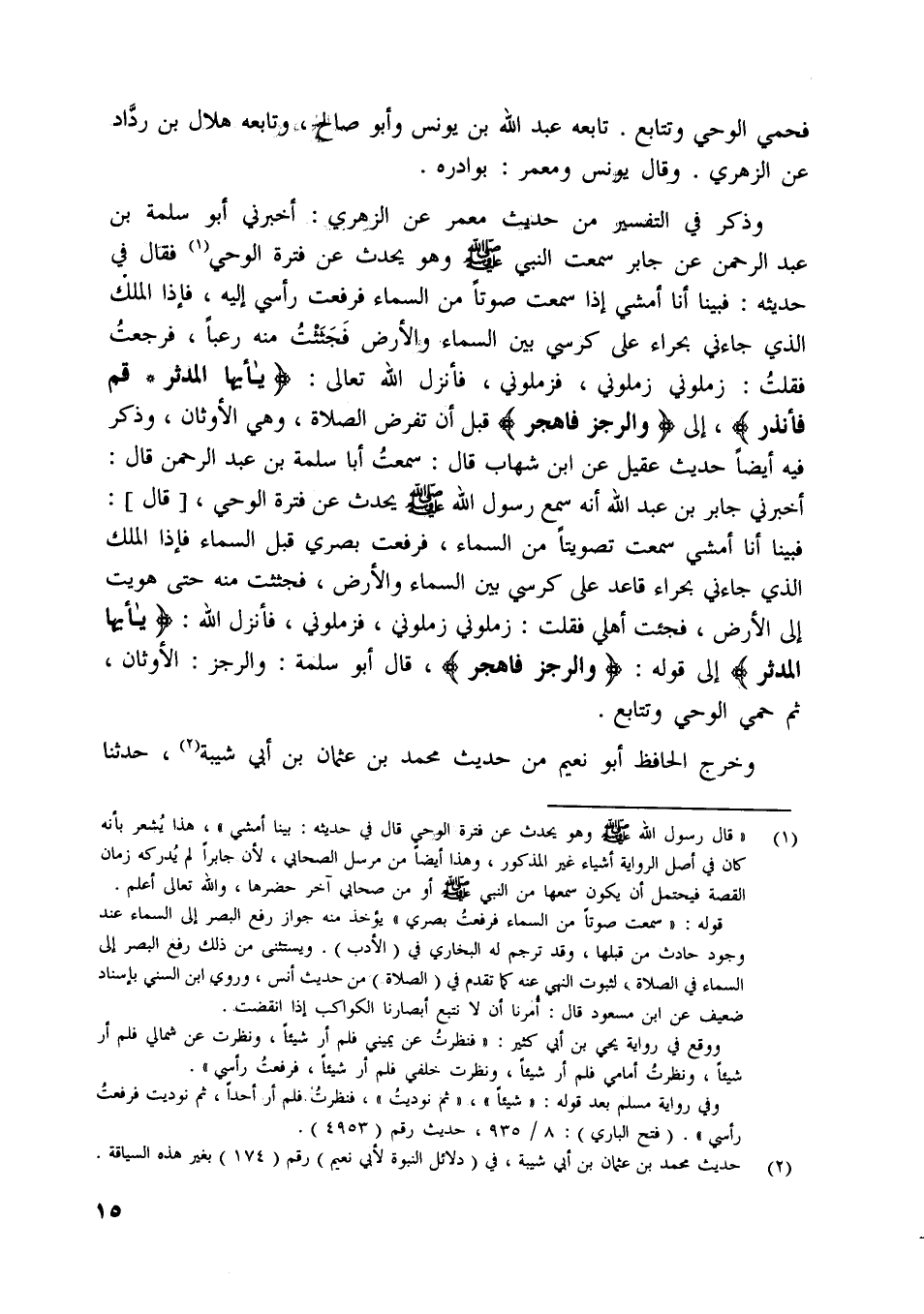أخبرني جابر بن عبد اللَّه أنه سمع رسول اللَّه صلّى اللَّه عليه وسلّم يحدث عن فترة الوحي، [قال] : فبينا أنا أمشي سمعت تصويتا من السماء، فرفعت بصري قبل السماء فإذا الملك الّذي جاءني بحراء قاعد على كرسي بين السماء والأرض، فجثثت منه حتى هويت إلى الأرض، فجئت أهلي فقلت: زملوني زملوني، فزملوني، فأنزل اللَّه: يا أَيُّهَا الْمُدَّثِّرُ إلى قوله: وَالرُّجْزَ فَاهْجُرْ،