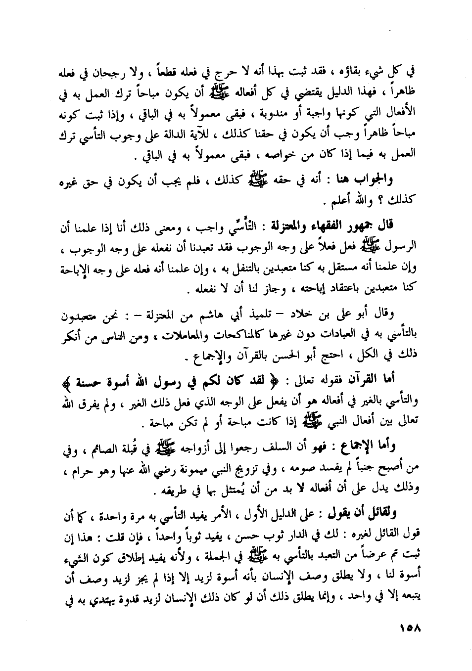 وقال أبو على بن خلاد- تلميذ أبي هاشم من المعتزلة-: نحن متعبدون بالتأسي به في العبادات دون غيرها كالمناكحات والمعاملات، ومن الناس من أنكر ذلك في الكل، احتج أبو الحسن بالقرآن والإجماع.