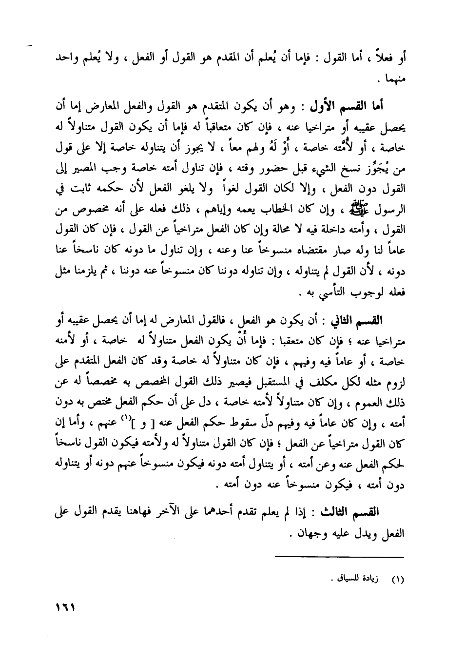 القسم الثاني: أن يكون هو الفعل، فالقول المعارض له إما أن يحصل عقيبه أو متراخيا عنه، فإن كان متعقبا: فإما أن يكون الفعل متناولا له خاصة، أو لأمنه خاصة، أو عاما فيه وفيهم، فإن كان متناولا له خاصة وقد كان الفعل المتقدم على لزوم مثله لكل مكلف في المستقبل فيصير ذلك القول المخصص به مخصصا له عن ذلك العموم، وإن كان متناولا لأمته خاصة، دل على أن حكم الفعل مختص به دون أمته، وإن كان عاما فيه وفيهم دلّ سقوط حكم الفعل عنه [و] [ (1) ] عنهم، وأما إن كان القول متراخيا عن الفعل، فإن كان القول متناولا له ولأمته فيكون القول ناسخا لحكم الفعل عنه وعن أمته، أو يتناول أمته دونه فيكون منسوخا عنهم دونه أو يتناوله دون أمته، فيكون منسوخا عنه دون أمته.