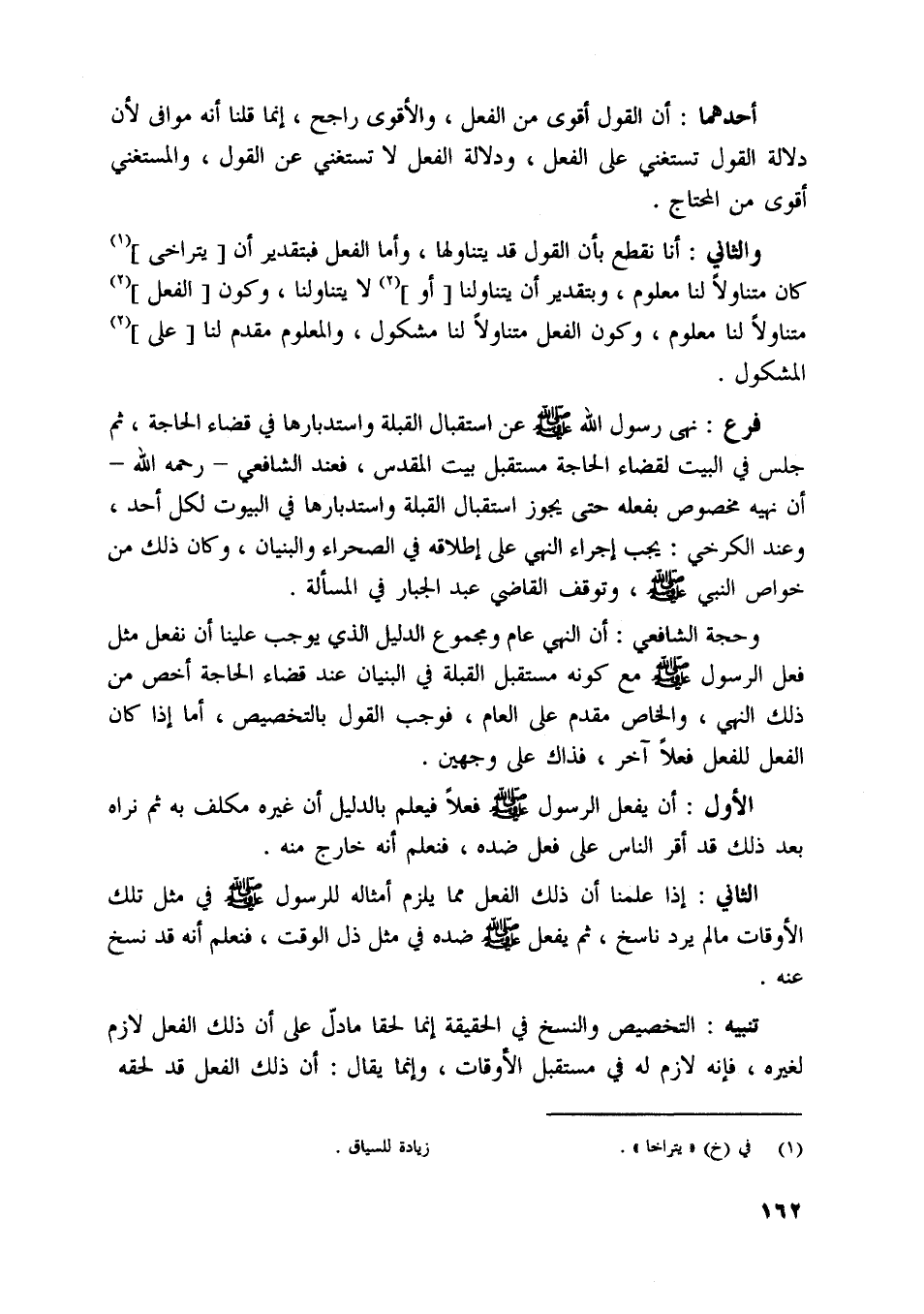 فرع: نهى رسول اللَّه صلى اللَّه عليه وسلّم عن استقبال القبلة واستدبارها في قضاء الحاجة، ثم جلس في البيت لقضاء الحاجة مستقبل بيت المقدس، فعند الشافعيّ- رحمه اللَّه- أن نهيه مخصوص بفعله حتى يجوز استقبال القبلة واستدبارها في البيوت لكل أحد، وعند الكرخي: يجب إجراء النهي على إطلاقه في الصحراء والبنيان، وكان ذلك من خواص النبي صلى اللَّه عليه وسلّم، وتوقف القاضي عبد الجبار في المسألة.