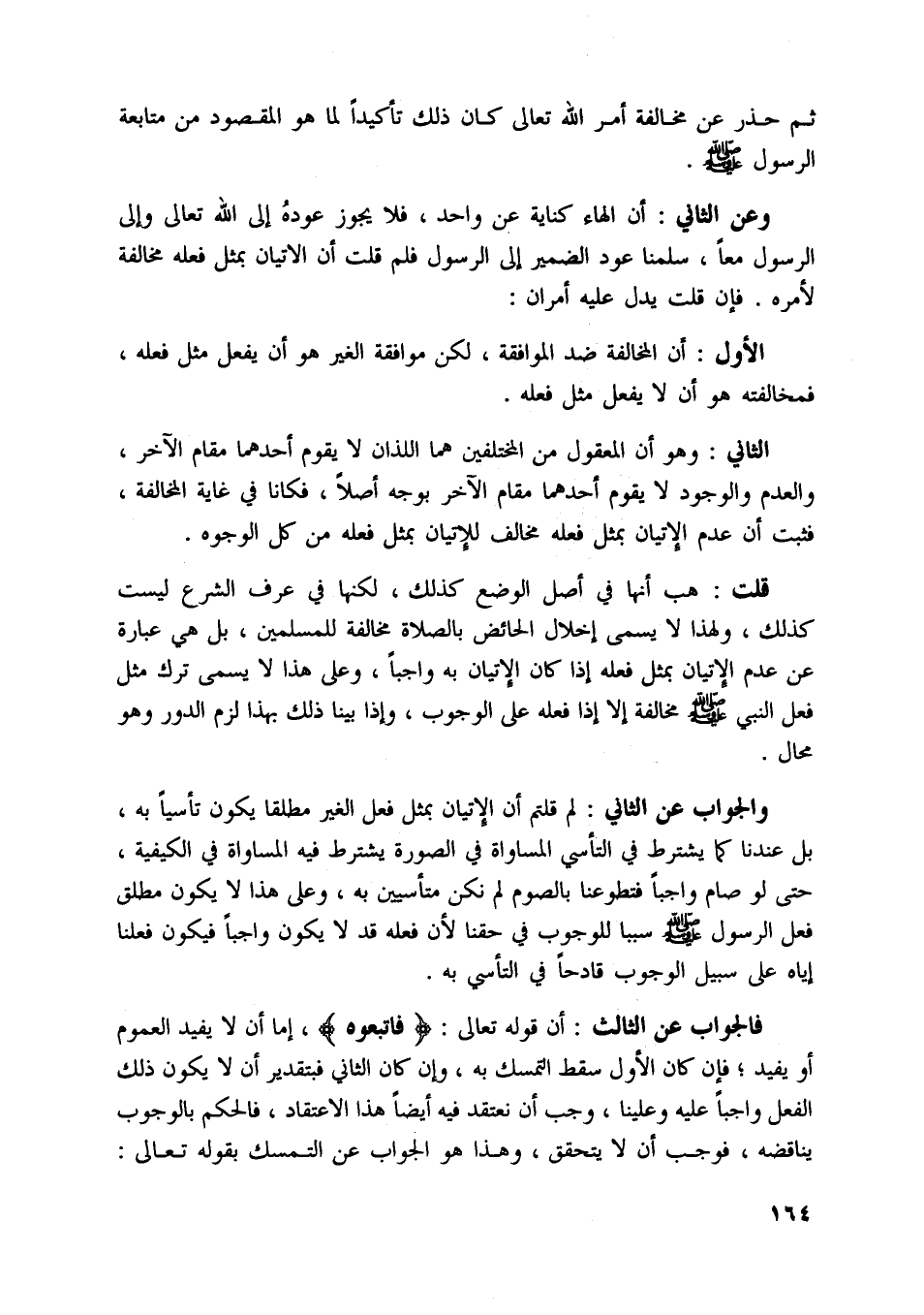وعن الثاني: أن الهاء كناية عن واحد، فلا يجوز عوده إلى اللَّه تعالى وإلى الرسول معا، سلمنا عود الضمير إلى الرسول فلم قلت أن الإتيان بمثل فعله مخالفة لأمره. فإن قلت يدل عليه أمران: