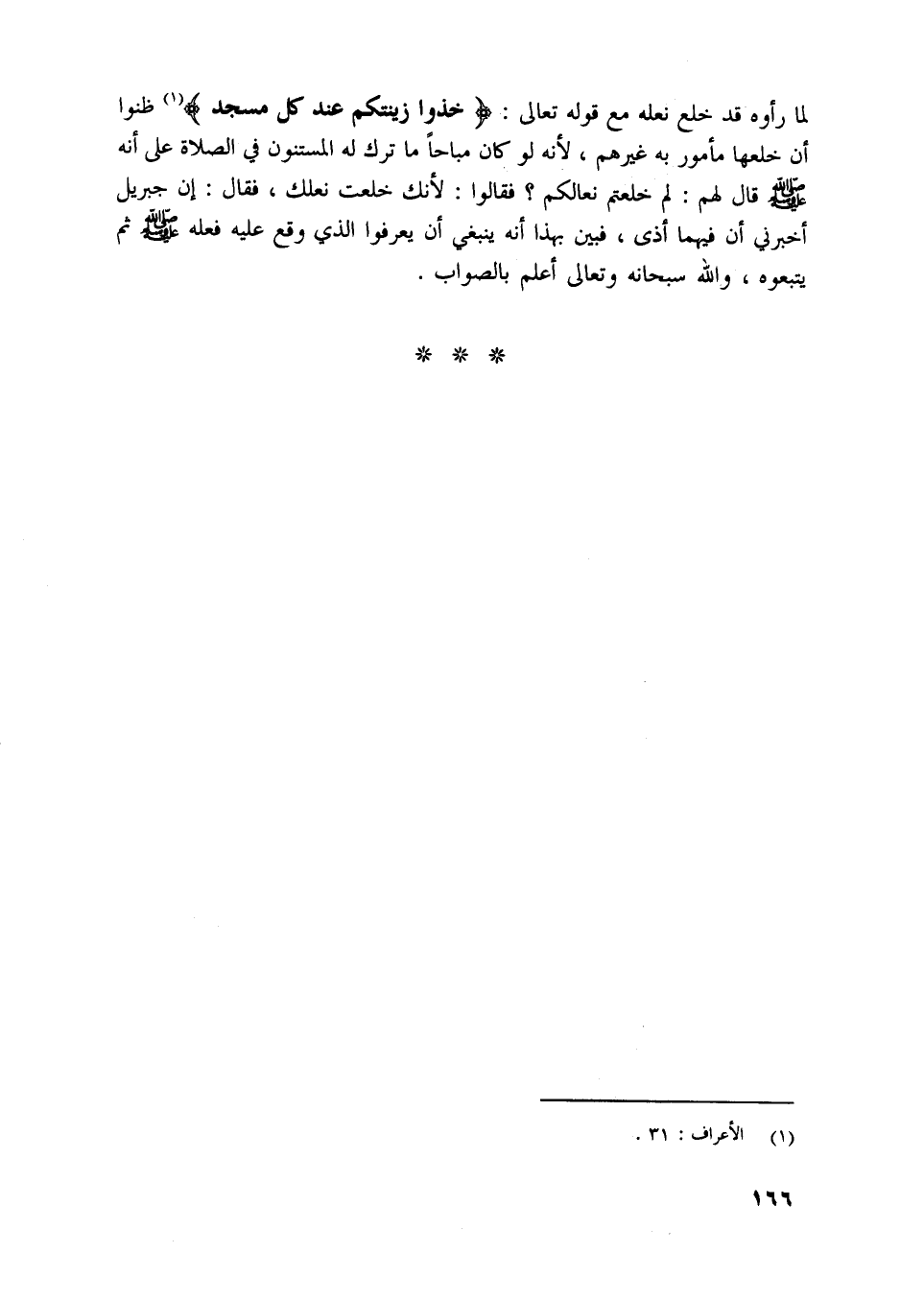 أنه صلى اللَّه عليه وسلّم قال لهم: لم خلعتم نعالكم؟ فقالوا: لأنك خلعت نعلك، فقال: إن جبريل أخبرني أن فيهما أذى،
