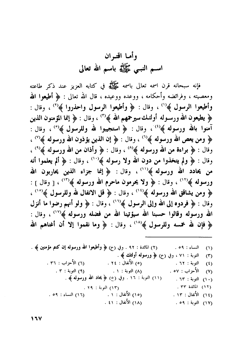 [ (6) ] ، وقال: إِنَّ الَّذِينَ يُؤْذُونَ اللَّهَ وَرَسُولَهُ [ (7) ] ، وقال: بَراءَةٌ مِنَ اللَّهِ وَرَسُولِهِ [ (8) ] ، وقال: وَأَذانٌ مِنَ اللَّهِ وَرَسُولِهِ [ (9) ] ، وقال: وَلَمْ يَتَّخِذُوا مِنْ دُونِ اللَّهِ وَلا رَسُولِهِ [ (10) ] ، وقال: أَلَمْ يَعْلَمُوا أَنَّهُ مَنْ يُحادِدِ اللَّهَ وَرَسُولَهُ [ (11) ] ، وقال: إِنَّما جَزاءُ الَّذِينَ يُحارِبُونَ اللَّهَ وَرَسُولَهُ [ (12) ] ، وقال: وَلا يُحَرِّمُونَ ما حَرَّمَ اللَّهُ وَرَسُولُهُ [ (13) ] ، [وقال] : وَمَنْ يُشاقِقِ اللَّهَ وَرَسُولَهُ [ (14) ] ، وقال: قُلِ الْأَنْفالُ لِلَّهِ وَالرَّسُولِ [ (15) ] ، وقال: فَرُدُّوهُ إِلَى اللَّهِ وَالرَّسُولِ [ (16) ] ، وقال: وَلَوْ أَنَّهُمْ رَضُوا ما آتاهُمُ اللَّهُ وَرَسُولُهُ وَقالُوا حَسْبُنَا اللَّهُ سَيُؤْتِينَا اللَّهُ مِنْ فَضْلِهِ وَرَسُولُهُ [ (17) ] ، وقال: