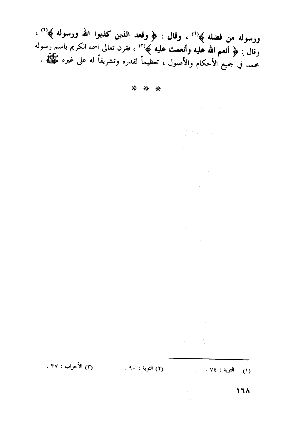 وَرَسُولُهُ مِنْ فَضْلِهِ [ (1) ] ، وقال: وَقَعَدَ الَّذِينَ كَذَبُوا اللَّهَ وَرَسُولَهُ [ (2) ] ، وقال: أَنْعَمَ اللَّهُ عَلَيْهِ وَأَنْعَمْتَ عَلَيْهِ [ (3) ] ، فقرن تعالى اسمه الكريم باسم رسوله محمد في جميع الأحكام والأصول، تعظيما لقدره وتشريفا له على غيره صلى اللَّه عليه وسلّم.
