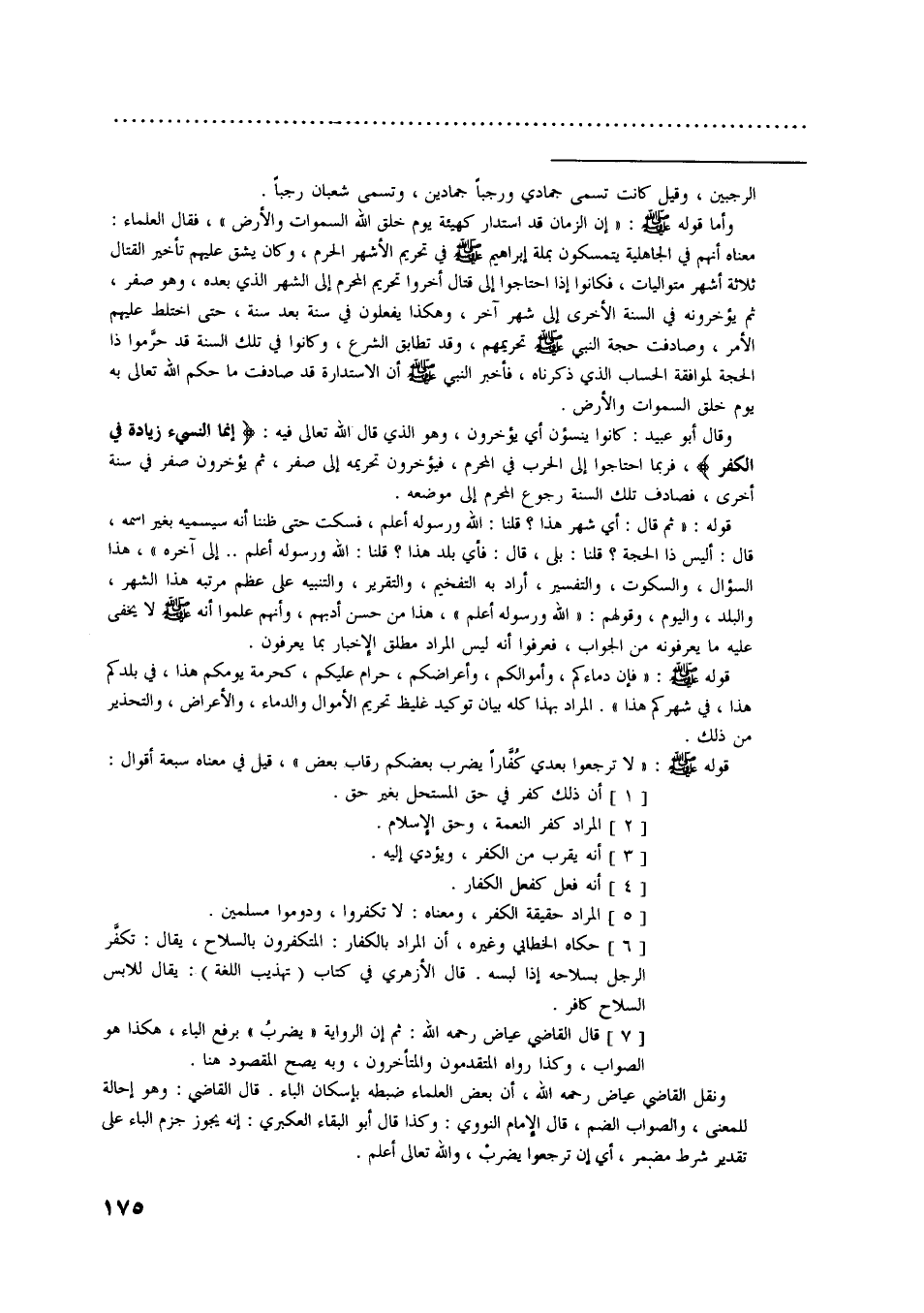 معناه أنهم في الجاهلية يتمسكون بملة إبراهيم صلى اللَّه عليه وسلّم في تحريم الأشهر الحرم، وكان يشق عليهم تأخير القتال ثلاثة أشهر متواليات، فكانوا إذا احتاجوا إلى قتال أخروا تحريم المحرم إلى الشهر الّذي بعده، وهو صفر، ثم يؤخرونه في السنة الأخرى إلى شهر آخر، وهكذا يفعلون في سنة بعد سنة، حتى اختلط عليهم الأمر، وصادفت حجة النبي صلى اللَّه عليه وسلّم تحريمهم، وقد تطابق الشرع، وكانوا في تلك السنة قد حرّموا ذا الحجة لموافقة الحساب الّذي ذكرناه، فأخبر النبي صلى اللَّه عليه وسلّم أن الاستدارة قد صادفت ما حكم اللَّه تعالى به يوم خلق السموات والأرض.