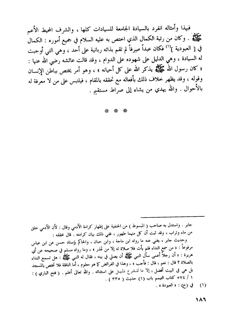 فبهذا وأمثاله انفرد بالسيادة الجامعة للسيادات كلها، والشرف المحيط الأعم صلى اللَّه عليه وسلّم. وكان من رتبة الكمال الّذي اختص به عليه السلام في جميع أموره: الكمال في [العبوديّة] [ (1) ] فكان عبدا صرفا لم تقم بذاته ربانية على أحد، وهي التي أوجبت له السيادة، وهي الدليل على شهوده على الدوام، وقد قالت عائشة رضي اللَّه عنها: