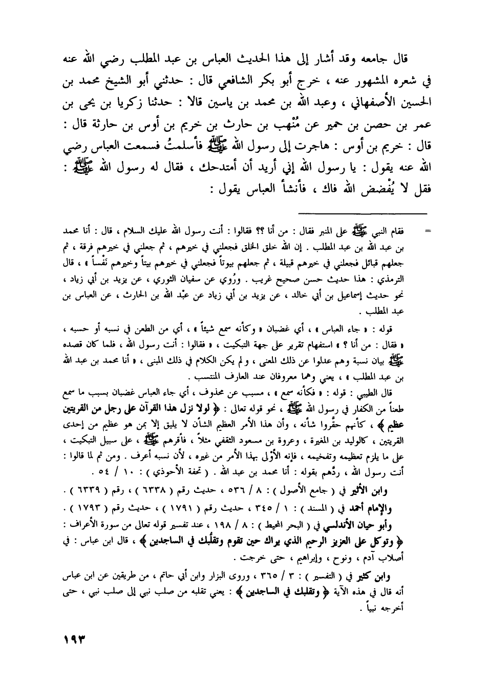 قال جامعه قد أشار إلي هذا الحديث العباس بن عبد المطلب رضي اللَّه عنه في شعره المشهور عنه،