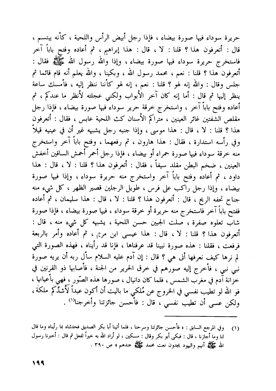 أتعرفون هذا؟ قلنا: نعم، محمد رسول اللَّه، وبكينا، واللَّه يعلم أنه قام قائما ثم جلس وقال: واللَّه إنه لهو؟ قلنا: نعم، إنه لهو كأننا ننظر إليه، فأمسك ساعة ينظر إليها ثم قال: أما إنه كان آخر الأبواب ولكني عجلته لأنظر ما عندكم، ثم أعاده وفتح بابا آخر، واستخرج خرقة حرير سوداء فيها صورة بيضاء، فإذا رجل مقلص الشفتين غائر العينين، متراكم الأسنان كث اللحية عابس، فقال: أتعرفون هذا؟ قلنا: لا، قال: هذا موسى، وإذا جنبه رجل يشبهه غير أن في عينيه قيلا وفي رأسه استدارة، فقال: هذا هارون، ثم رفعهما، وفتح بابا آخر واستخرج منه خرقة سوداء فيها صورة حمراء أو بيضاء، فإذا رجل أحمر أحمش الساقين أخفش العينين، ضخم البطن مقلد سيفا، فقال: أتعرفون هذا؟ قلنا: لا، قال: هذا داود، ثم أعاده وفتح بابا آخر واستخرج منه حريرة سوداء، وإذا فيها صورة بيضاء، وإذا رجل راكب على فرس، طويل الرجلين قصير الظهر، كل شيء منه جناح تحفه الريح، قال: أتعرفون هذا؟ قلنا: لا، قال: هذا سليمان، ثم أعاده ففتح بابا آخر فاستخرج منه حريرة أو خرقة سوداء، فيها صورة بيضاء، فإذا صورة شاب تعلوه صفرة، صلت الجبين حسن اللحية، يشبهه كل شيء منه، قال: