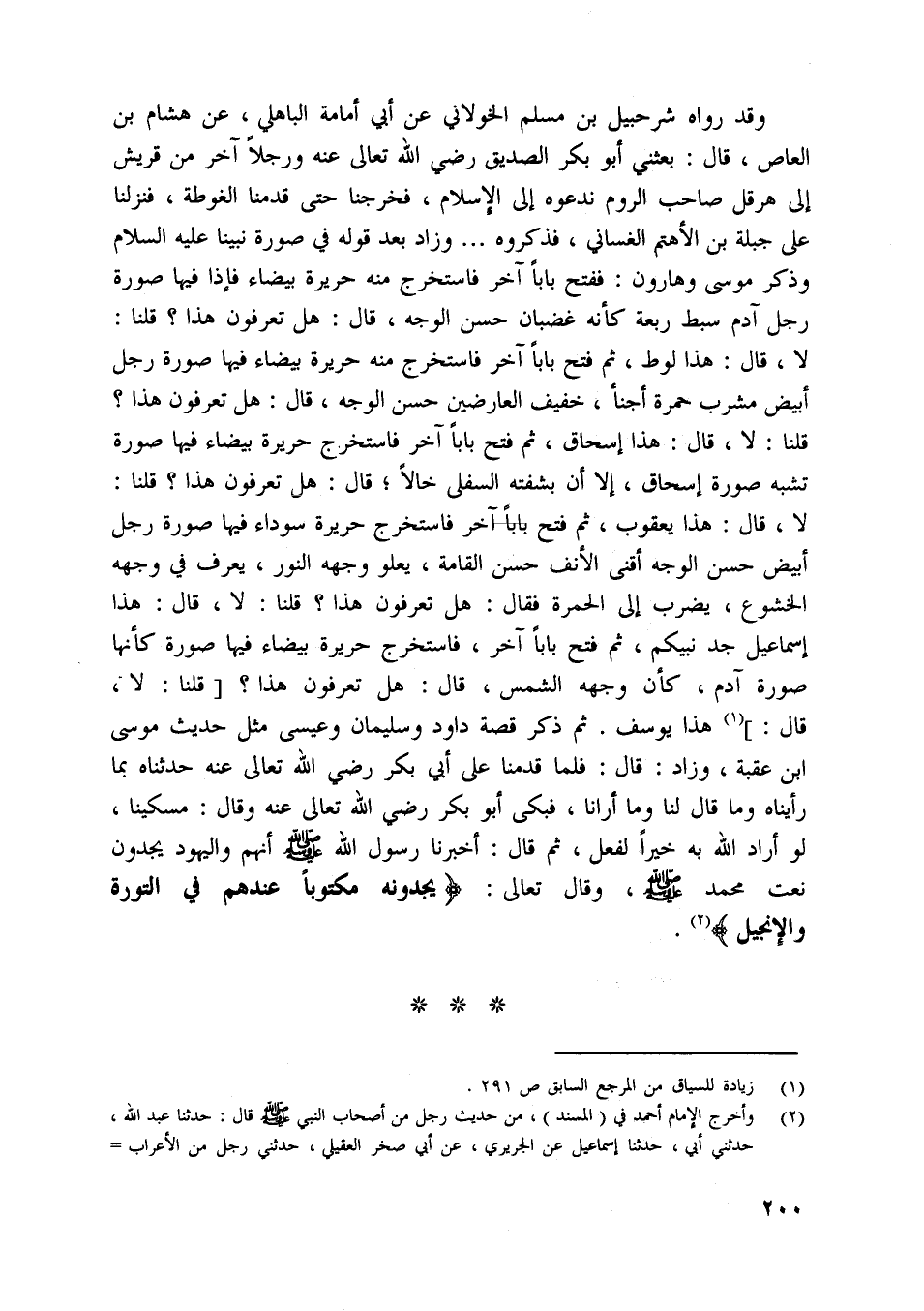 وقد رواه شرحبيل بن مسلم الخولانيّ عن أبي أمامة الباهلي، عن هشام بن العاص، قال: بعثني أبو بكر الصديق رضي اللَّه تعالى عنه ورجلا آخر من قريش إلى هرقل صاحب الروم ندعوه إلى الإسلام، فخرجنا حتى قدمنا الغوطة، فنزلنا على جبلة بن الأهتم الغساني، فذكروه ... وزاد بعد قوله في صورة نبينا عليه السلام وذكر موسى وهارون: ففتح بابا آخر فاستخرج منه حريرة بيضاء فإذا فيها صورة رجل آدم سبط ربعة كأنه غضبان حسن الوجه، قال: هل تعرفون هذا؟ قلنا: