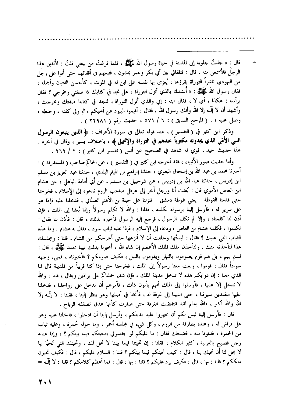 [ () ] قال: «جلبت جلوبة إلى المدينة في حياة رسول اللَّه صلى اللَّه عليه وسلّم، فلما فرغت من بيعتي قلت: لألقين هذا الرجل فلأسمعن منه، قال: فتلقاني بين أبي بكر وعمر يمشون، فتبعهم في أقفائهم حتى أتوا على رجل من اليهودي ناشرا التوراة يقرؤها، يعزى بها نفسه على ابن له في الموت، كأحسن الفتيان وأجمله، فقال رسول اللَّه صلى اللَّه عليه وسلّم: «أنشدك بالذي أنزل التوراة، هل تجد في كتابك ذا صفتي ومخرجي؟ فقال برأسه: هكذا، أي لا، فقال ابنه: إني والّذي أنزل التوراة، لنجد في كتابنا صفتك ومخرجك، وأشهد أن لا إله إلا اللَّه وأنك رسول اللَّه، فقال: أقيموا اليهود عن أخيكم، ثم ولى كفنه، وحنطه، وصلى عليه» . (المرجع السابق) : 6/ 571، حديث رقم (22981) .