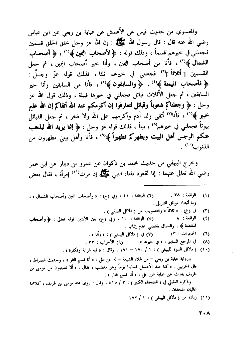 فَأَصْحابُ الْمَيْمَنَةِ [ (4) ] ، وَالسَّابِقُونَ [ (5) ] ، فأنا من السابقين وأنا خير السابقين، ثم جعل الأثلاث قبائل فجعلني في خيرها قبيلة، وذلك قول اللَّه عز وجل: وَجَعَلْناكُمْ شُعُوباً وَقَبائِلَ لِتَعارَفُوا إِنَّ أَكْرَمَكُمْ عِنْدَ اللَّهِ أَتْقاكُمْ إِنَّ اللَّهَ عَلِيمٌ خَبِيرٌ [ (6) ] ، فأنا [ (7) ] أتقى ولد آدم وأكرمهم على اللَّه ولا فخر، ثم جعل القبائل بيوتا فجعلني في خيرهم [ (8) ] ، بيتا، فذلك قوله عز وجل: إِنَّما يُرِيدُ اللَّهُ لِيُذْهِبَ عَنْكُمُ الرِّجْسَ أَهْلَ الْبَيْتِ وَيُطَهِّرَكُمْ تَطْهِيراً [ (9) ] ، فأنا وأهل بيتي مطهرون من الذنوب [ (10) ] .