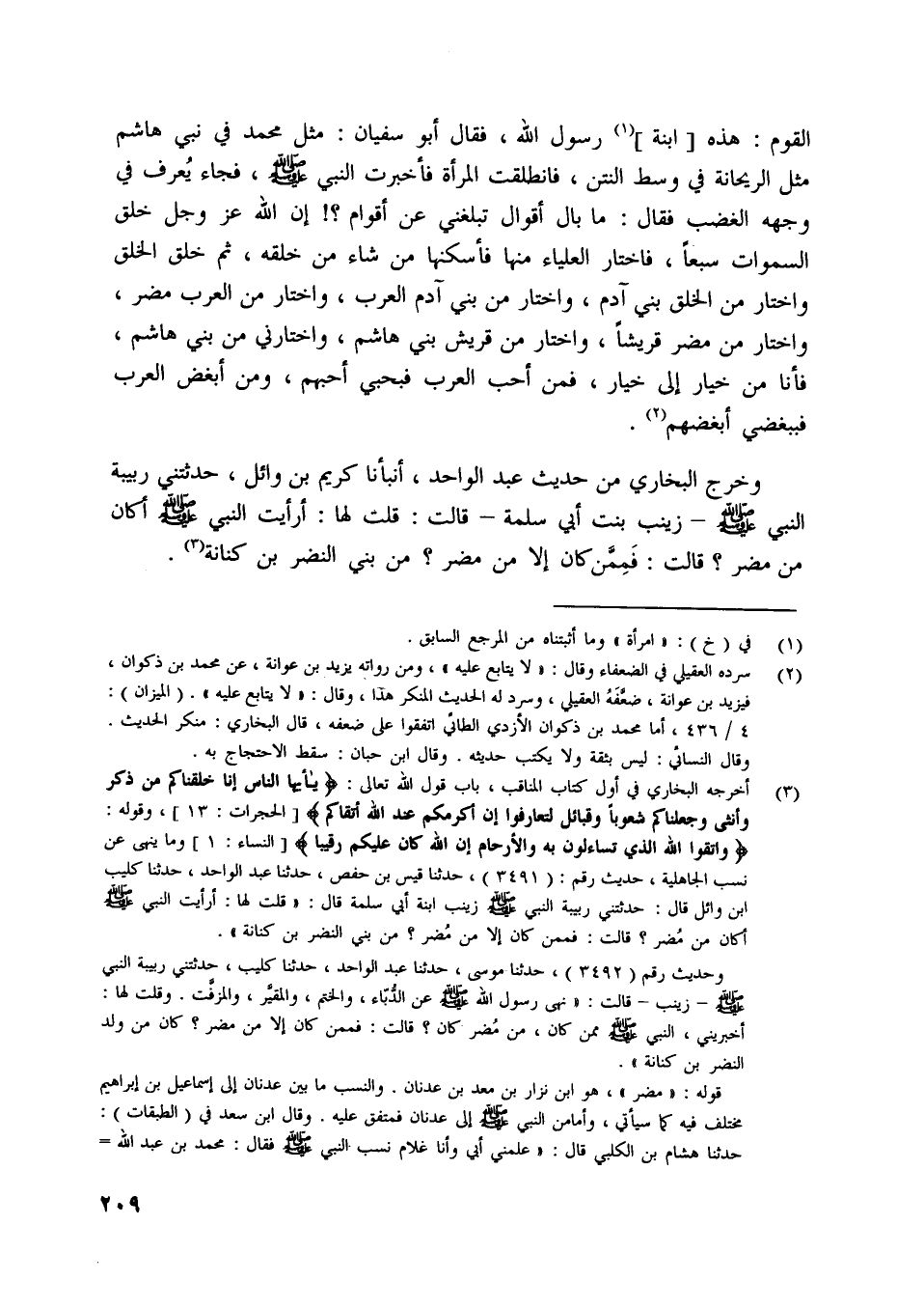 وخرج البخاري من حديث عبد الواحد، أنبأنا كريم بن وائل، حدثتني ربيبة النبي صلى اللَّه عليه وسلّم- زينب بنت أبي سلمة- قالت: قلت لها: أرأيت النبي صلى اللَّه عليه وسلّم أكان من مضر؟ قالت: فممّن كان إلا من مضر؟ من بني النضر بن كنانة [ (3) ] .