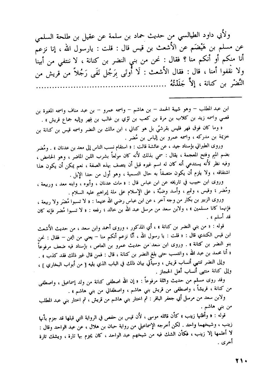 ولأبي داود الطيالسي من حديث حماد بن سلمة عن عقيل بن طلحة السلمي عن مسلم بن هيضم عن الأشعث بن قيس قال: قلت: يا رسول اللَّه، إنا نزعم أنا منكم أو أنكم منا؟ فقال: نحن من بني النضر بن كنانة، لا ننتفي من أبينا ولا نقفوا أمنا،