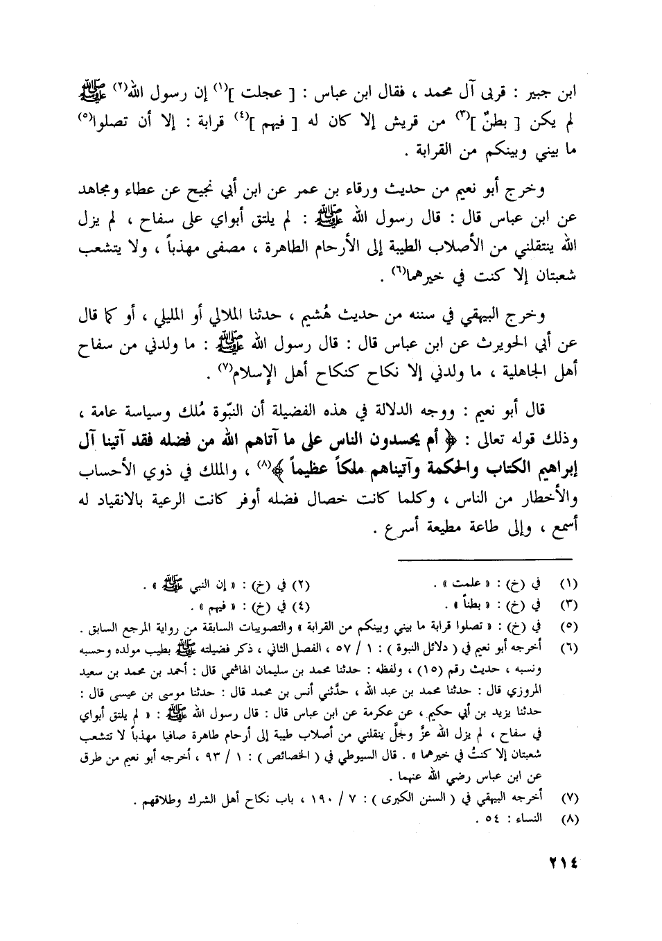 ابن جبير: قربي آل محمد، فقال ابن عباس: [عجلت] [ (1) ] إن رسول اللَّه [ (2) ] صلى اللَّه عليه وسلّم لم يكن [بطن] [ (3) ] من قريش إلا كان له [فيهم] [ (4) ] قرابة: إلا أن تصلوا [ (5) ] ما بيني وبينكم من القرابة.
