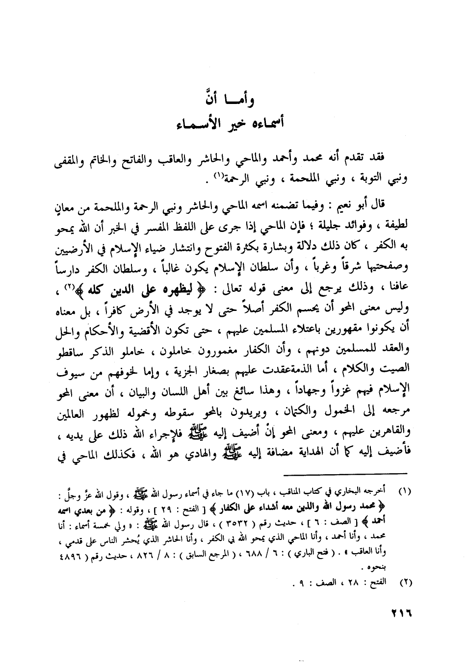 قال أبو نعيم: وفيما تضمنه اسمه الماحي والحاشر ونبي الرحمة والملحمة من معان لطيفة، وفوائد جليلة، فإن الماحي إذا جرى على اللفظ المفسر في الخبر أن اللَّه يمحو به الكفر، كان ذلك دلالة وبشارة بكثرة الفتوح وانتشار ضياء الإسلام في الأرضيين وصفحتيها شرقا وغربا، وأن سلطان الإسلام يكون غالبا، وسلطان الكفر دارسا عافنا، وذلك يرجع إلى معنى قوله تعالى: لِيُظْهِرَهُ عَلَى الدِّينِ كُلِّهِ [ (2) ] ، وليس معنى المحو أن يحسم الكفر أصلا حتى لا يوجد في الأرض كافرا، بل معناه أن يكونوا مقهورين باعتلاء المسلمين عليهم، حتى تكون الأقضية والأحكام والحل والعقد للمسلمين دونهم، وأن الكفار مغمورون خاملون، خاملو الذكر ساقطو الصيت والكلام، أما الذمة عقدت عليهم بصغار الجزية، وإما لخوفهم من سيوف الإسلام فيهم غزوا وجهادا، وهذا سائغ بين أهل اللسان والبيان، أن معنى المحو مرجعه إلى الخمول والكتمان، ويريدون بالمحو سقوطه وخموله لظهور العالمين والقاهرين عليهم، ومعنى المحو إن أضيف إليه صلى اللَّه عليه وسلّم فلإجراء اللَّه ذلك على يديه، فأضيف إليه كما أن الهداية مضافة إليه صلى اللَّه عليه وسلّم والهادي هو اللَّه، فكذلك الماحي في