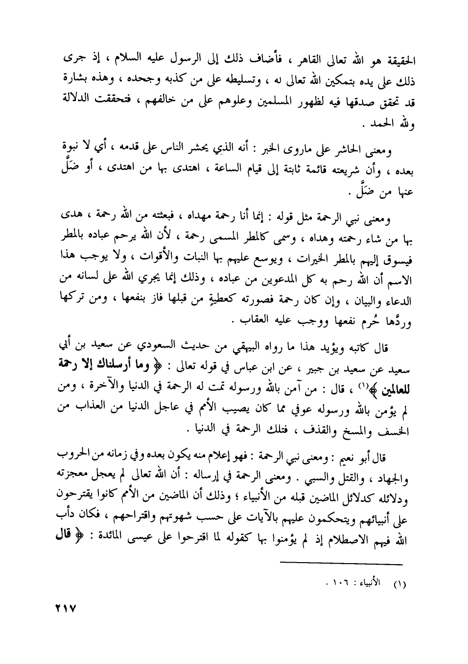 قال كاتبه ويؤيد هذا ما رواه البيهقي من حديث السعودي عن سعيد بن أبي سعيد عن سعيد بن جبير، عن ابن عباس في قوله تعالى: وَما أَرْسَلْناكَ إِلَّا رَحْمَةً لِلْعالَمِينَ [ (1) ] ، قال: من آمن باللَّه ورسوله تمت له الرحمة في الدنيا والآخرة، ومن لم يؤمن باللَّه ورسوله عوفي مما كان يصيب الأمم في عاجل الدنيا من العذاب من الخسف والمسخ والقذف، فتلك الرحمة في الدنيا.