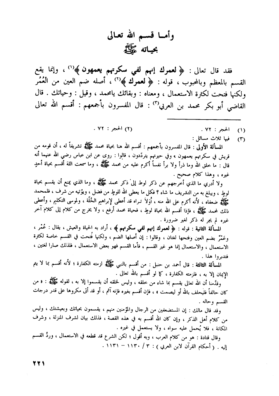 وقد قال مالك: إن المستضعفين من الرجال والمؤمنين منهم، يقسمون بحياتك وبعيشتك، وليس من كلام أهل الذكر، وإن كان اللَّه أقسم به في هذه القصة، فذلك بيان لشرف المنزلة، وشرف المكانة، فلا يحمل عليه سواه، ولا يستعمل في غيره.