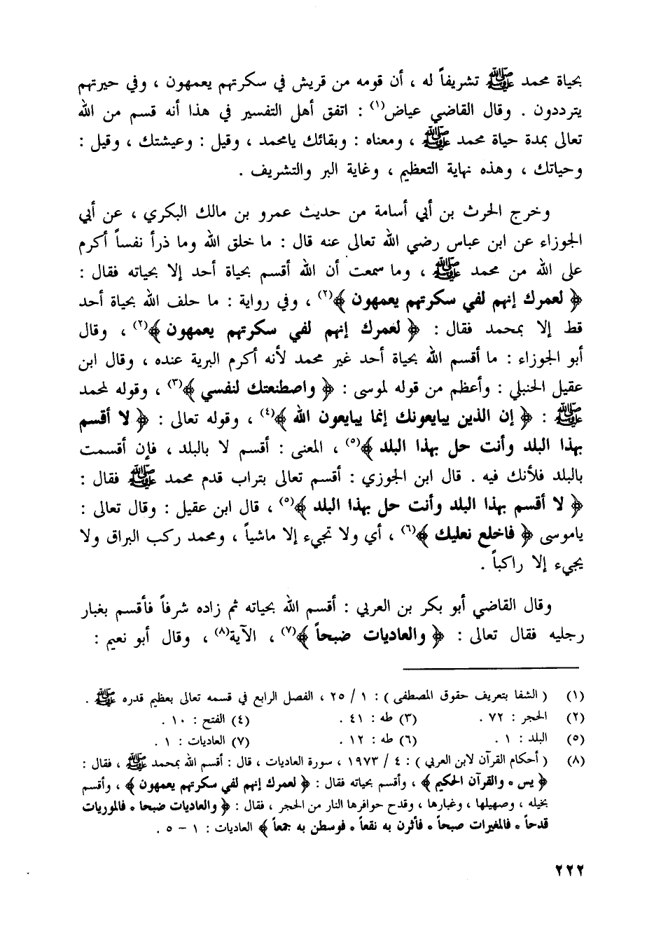 [ (1) ] (الشفا بتعريف حقوق المصطفى) : 1/ 25، الفصل الرابع في قسمه تعالى بعظيم قدره صلى اللَّه عليه وسلّم.
