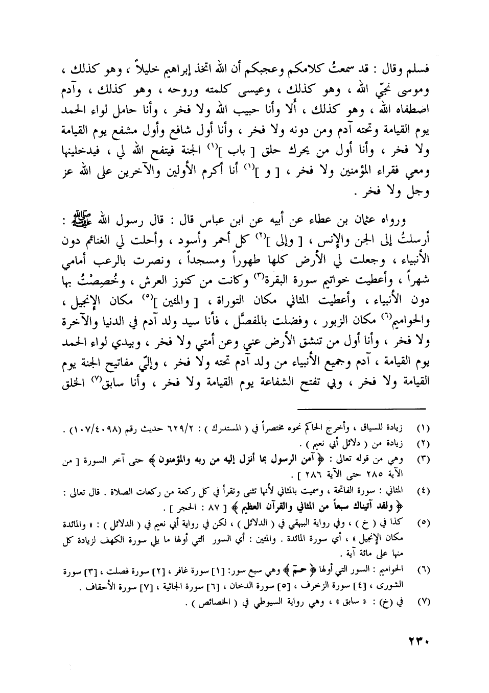 ورواه عثمان بن عطاء عن أبيه عن ابن عباس قال: قال رسول اللَّه صلى اللَّه عليه وسلّم: أرسلت إلى الجن والإنس، [وإلى] [ (2) ] كل أحمر وأسود، وأحلت لي الغنائم دون الأنبياء، وجعلت لي الأرض كلها طهورا ومسجدا، ونصرت بالرعب أمامي شهرا، وأعطيت خواتيم سورة البقرة [ (3) ] وكانت من كنوز العرش، وخصصت بها دون الأنبياء، وأعطيت المثاني [ (4) ] مكان التوراة، [والمئين] [ (5) ] مكان الإنجيل، والحواميم [ (6) ] مكان الزبور، وفضلت بالمفصّل، فأنا سيد ولد آدم في الدنيا والآخرة ولا فخر، وأنا أول من تنشق الأرض عني وعن أمتي ولا فخر، وبيدي لواء الحمد يوم القيامة، آدم وجميع الأنبياء من ولد آدم تحته ولا فخر، وإليّ مفاتيح الجنة يوم القيامة ولا فخر، وبي تفتح الشفاعة يوم القيامة ولا فخر، وأنا سابق [ (7) ] الخلق