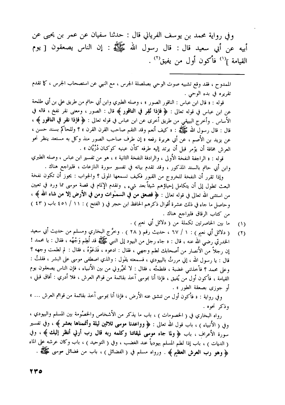 وفي رواية محمد بن يوسف الفرياني قال: حدثنا سفيان عن عمر بن يحيى عن أبيه عن أبي سعيد قال: قال رسول اللَّه صلى اللَّه عليه وسلّم: إن الناس يصعقون [يوم القيامة] [ (1) ] فأكون أول من يفيق [ (2) ] .