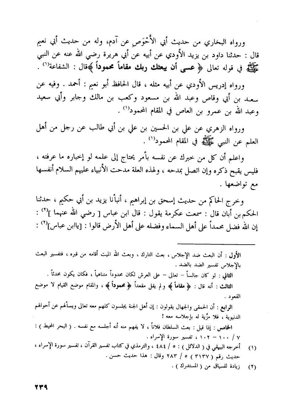 ورواه إدريس الأودي عن أبيه مثله، قال الحافظ أبو نعيم: أحمد. وفيه عن سعد بن أبي وقاص وعبد اللَّه بن مسعود وكعب بن مالك وجابر وأبي سعيد وعبد اللَّه بن عمرو بن العاص في المقام المحمود [ (1) ] .