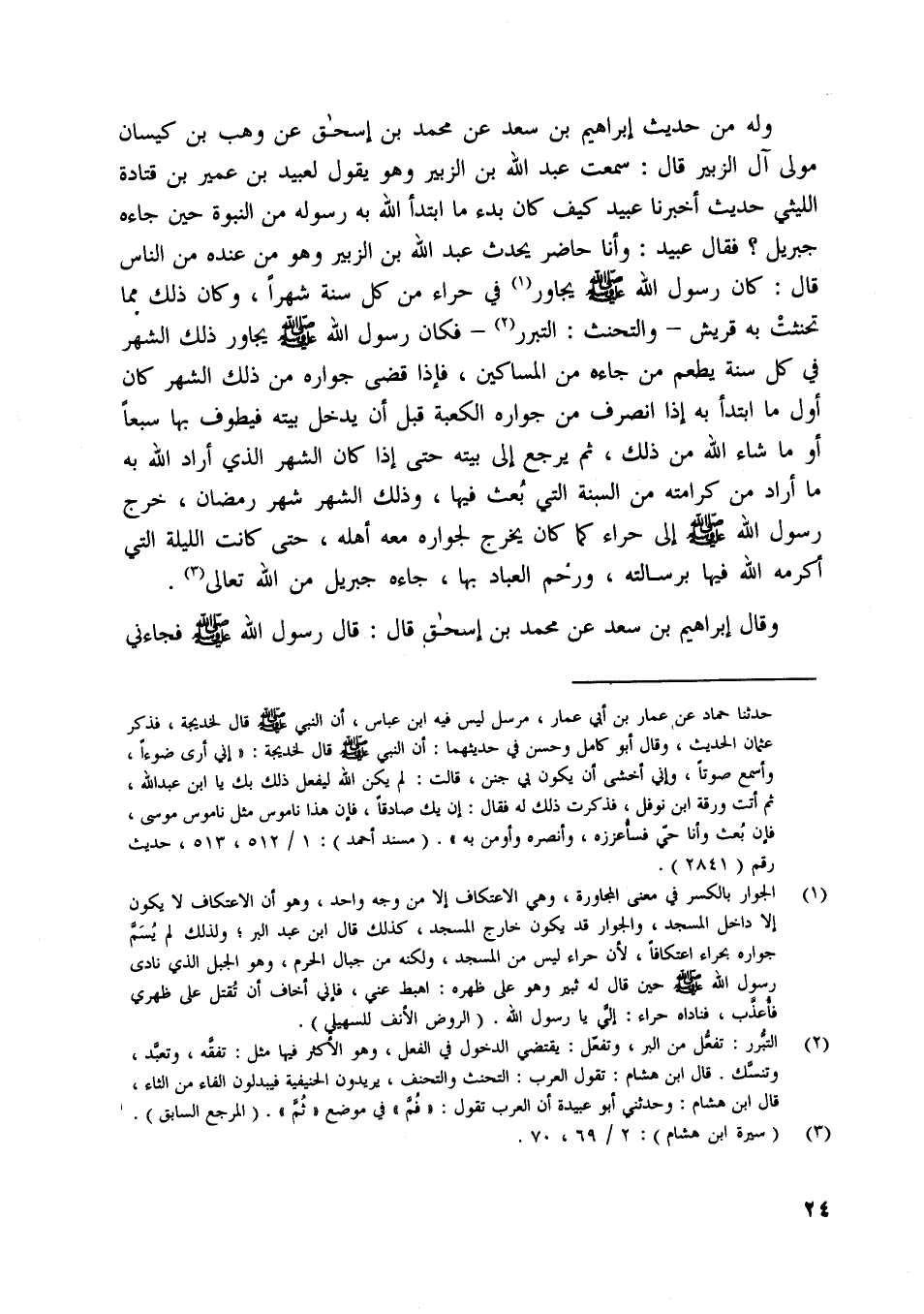 وله من حديث إبراهيم بن سعد عن محمد بن إسحاق عن وهب بن كيسان مولى آل الزبير قال: سمعت عبد اللَّه بن الزبير وهو يقول لعبيد بن عمير بن قتادة الليثي حديث أخبرنا عبيد كيف كان بدء ما ابتدأ اللَّه به رسوله من النبوة حين جاءه جبريل؟ فقال عبيد: وأنا حاضر يحدث عبد اللَّه بن الزبير وهو من عنده من الناس قال: كان رسول اللَّه صلّى اللَّه عليه وسلّم يجاور [ (1) ] في حراء من كل سنة شهرا، وكان ذلك مما تحنثت به قريش- والتحنث: التبرر [ (2) ]- فكان رسول اللَّه صلّى اللَّه عليه وسلّم يجاور ذلك الشهر في كل سنة يطعم من جاءه من المساكين، فإذا قضى جواره من ذلك الشهر كان أول ما ابتدأ به إذا انصرف من جواره الكعبة قبل أن يدخل بيته فيطوف بها سبعا أو ما شاء اللَّه من ذلك، ثم يرجع إلى بيته حتى إذا كان الشهر الّذي أراد اللَّه به ما أراد من كرامته من السنة التي بعث فيها، وذلك الشهر شهر رمضان، خرج رسول اللَّه صلّى اللَّه عليه وسلّم إلى حراء كما كان يخرج لجواره معه أهله، حتى كانت الليلة التي أكرمه اللَّه فيها برسالته، ورحم العباد بها، جاءه جبريل من اللَّه تعالى [ (3) ] .