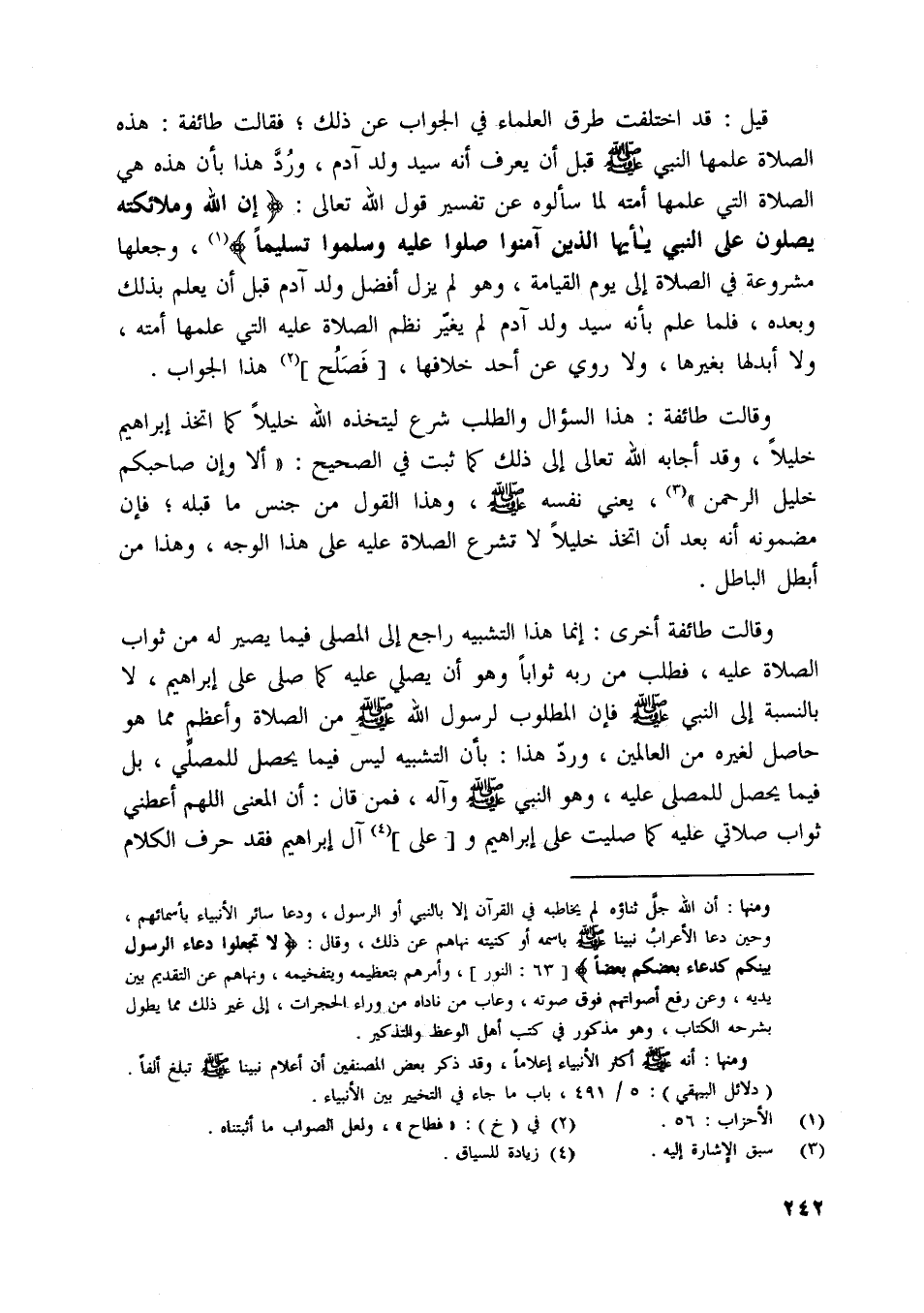 قيل: قد اختلفت طرق العلماء في الجواب عن ذلك، فقالت طائفة: هذه الصلاة علمها النبي صلى اللَّه عليه وسلّم قبل أن يعرف أنه سيد ولد آدم، وردّ هذا بأن هذه هي الصلاة التي علمها أمته لما سألوه عن تفسير قول اللَّه تعالى: إِنَّ اللَّهَ وَمَلائِكَتَهُ يُصَلُّونَ عَلَى النَّبِيِّ يا أَيُّهَا الَّذِينَ آمَنُوا صَلُّوا عَلَيْهِ وَسَلِّمُوا تَسْلِيماً [ (1) ] ، وجعلها مشروعة في الصلاة إلى يوم القيامة، وهو لم يزل أفضل ولد آدم قبل أن يعلم بذلك وبعده، فلما علم بأنه سيد ولد آدم لم يغيّر نظم الصلاة عليه التي علمها أمته، ولا أبدلها بغيرها، ولا روي عن أحد خلافها، [فصلح] [ (2) ] هذا الجواب.