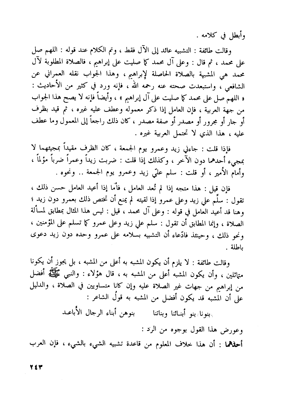 فإن قيل: هذا متجه إذا لم تعد العامل، فأما إذا أعيد العامل حسن ذلك، تقول: سلّم علي زيد وعلى عمرو إذا لقيته لم يمنع أن تختص ذلك بعمرو دون زيد، وهنا قد أعيد العامل في قوله: وعلى آل محمد، قيل: ليس هذا المثال بمطابق لمسألة الصلاة، وإنما المطابق أن تقول: سلّم علي زيد وعلى عمرو كما تسلم على المؤمنين، ونحو ذلك، وحينئذ فادّعاء أن التشبيه بسلامه على عمرو وحده دون زيد دعوى باطلة.