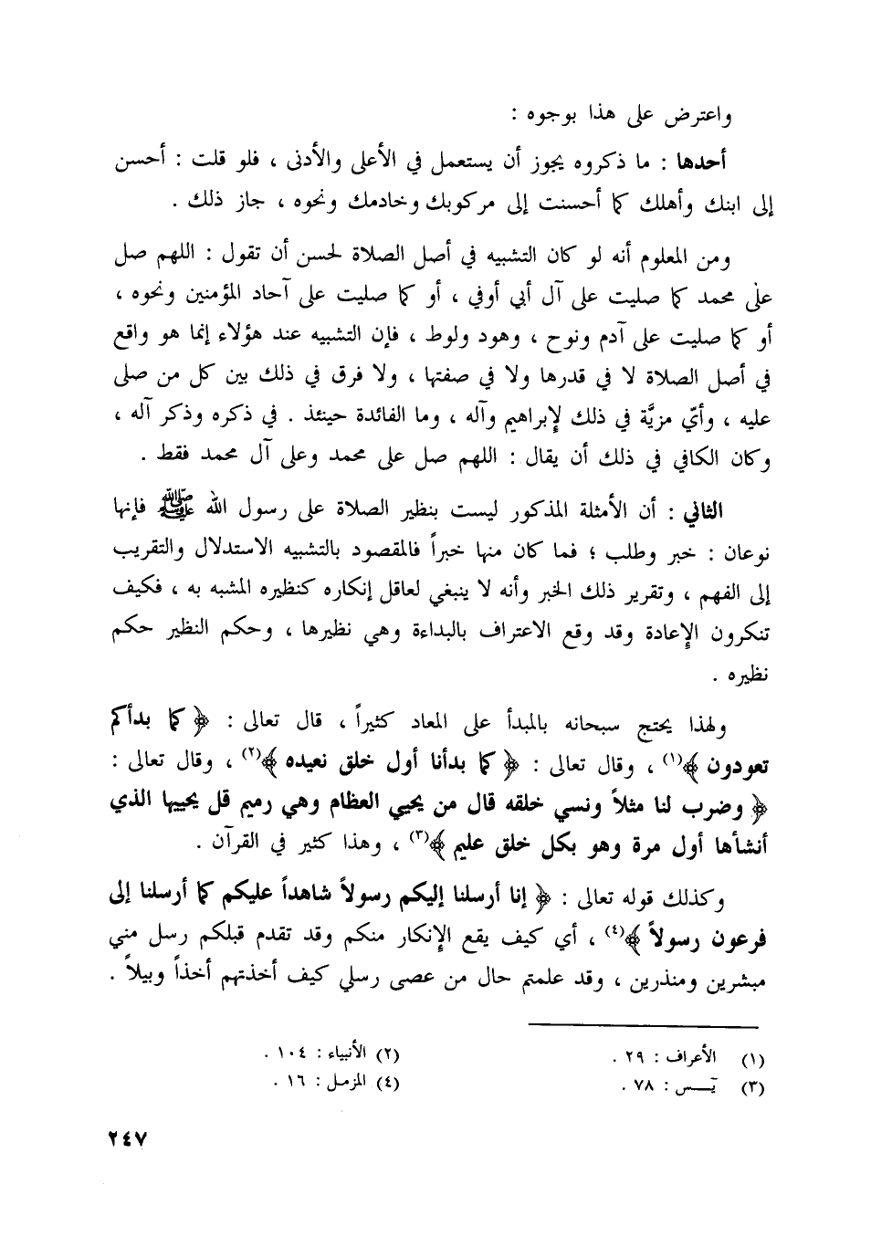 الثاني: أن الأمثلة المذكور ليست بنظير الصلاة على رسول اللَّه صلى اللَّه عليه وسلّم فإنّها نوعان: خبر وطلب، فما كان منها خبرا فالمقصود بالتشبيه الاستدلال والتقريب إلى الفهم، وتقرير ذلك الخبر وأنه لا ينبغي لعاقل إنكاره كنظيره المشبه به، فكيف تنكرون الإعادة وقد وقع الاعتراف بالبداءة وهي نظيرها، وحكم النظير حكم نظيره.