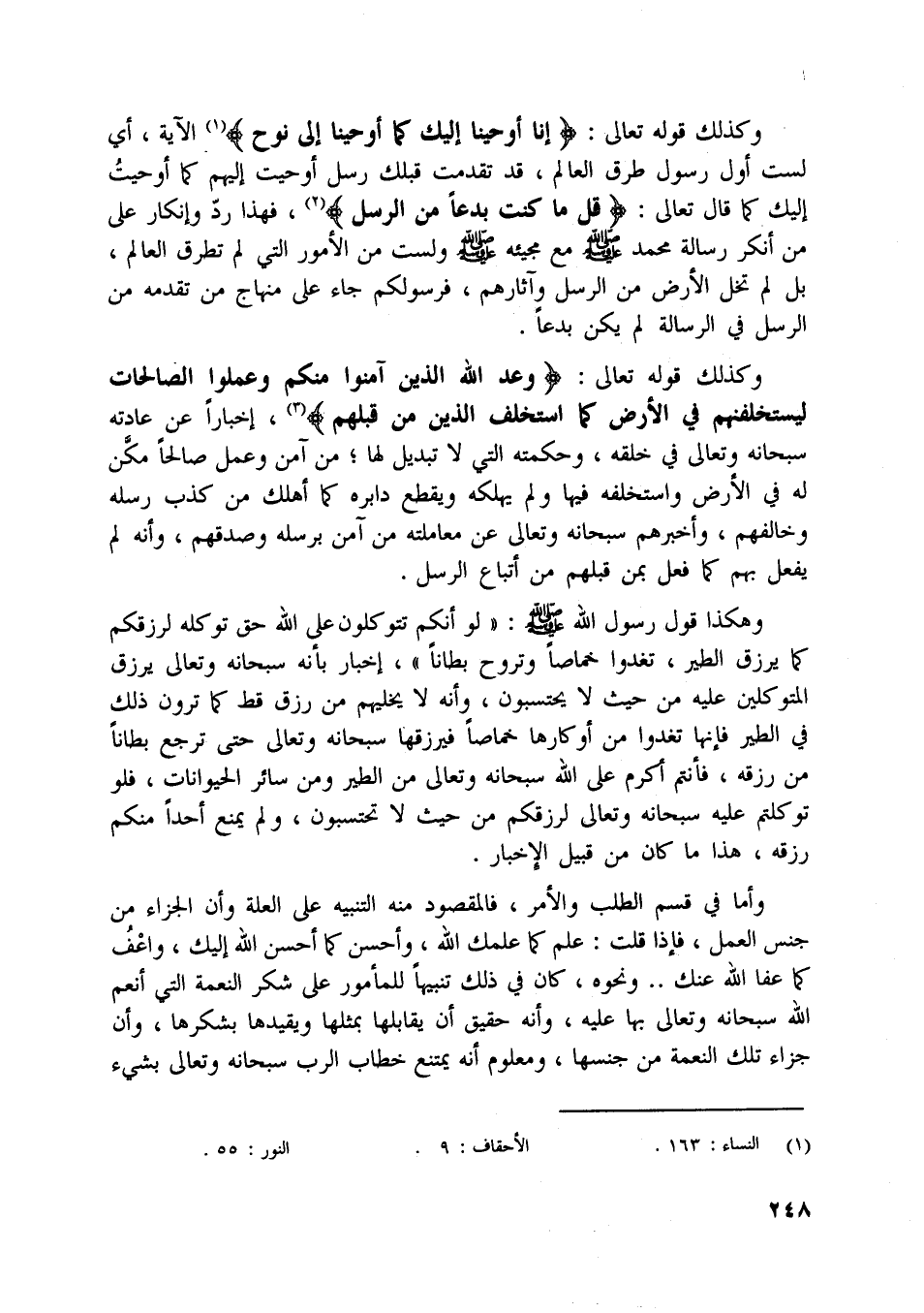 وكذلك قوله تعالى: إِنَّا أَوْحَيْنا إِلَيْكَ كَما أَوْحَيْنا إِلى نُوحٍ [ (1) ] الآية، أي لست أول رسول طرق العالم، قد تقدمت قبلك رسل أوحيت إليهم كما أوحيت إليك كما قال تعالى: قُلْ ما كُنْتُ بِدْعاً مِنَ الرُّسُلِ [ (2) ] ، فهذا ردّ وإنكار على من أنكر رسالة محمد صلى اللَّه عليه وسلّم مع مجيئه صلى اللَّه عليه وسلّم ولست من الأمور التي لم تطرق العالم، بل لم تخل الأرض من الرسل وآثارهم، فرسولكم جاء على منهاج من تقدمه من الرسل في الرسالة لم يكن بدعا.