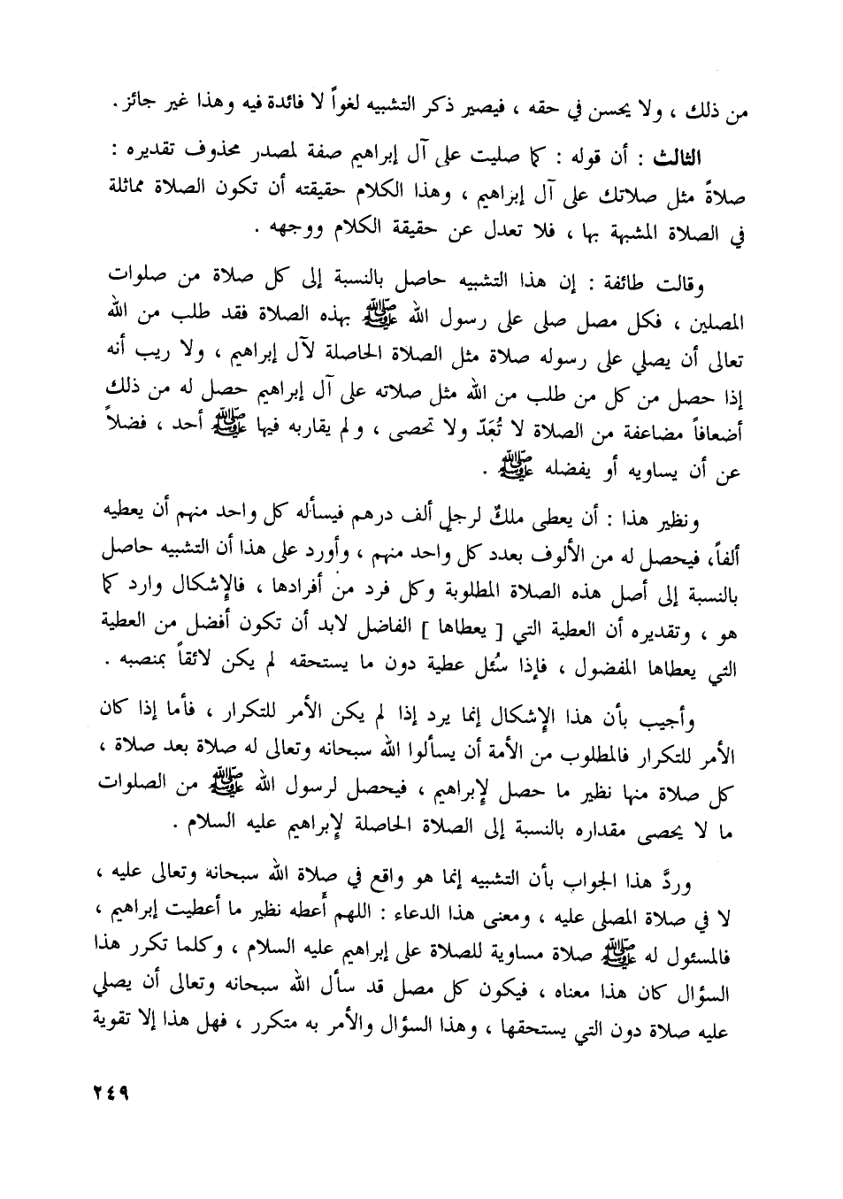 وقالت طائفة: إن هذا التشبيه حاصل بالنسبة إلى كل صلاة من صلوات المصلين، فكل مصل صلى على رسول اللَّه صلى اللَّه عليه وسلّم بهذه الصلاة فقد طلب من اللَّه تعالى أن يصلي على رسوله صلاة مثل الصلاة الحاصلة لآل إبراهيم، ولا ريب أنه إذا حصل من كل من طلب من اللَّه مثل صلاته على آل إبراهيم حصل له من ذلك أضعافا مضاعفة من الصلاة لا تعدّ ولا تحصى، ولم يقاربه فيها صلى اللَّه عليه وسلّم أحد، فضلا عن أن يساويه أو يفضله صلى اللَّه عليه وسلّم.