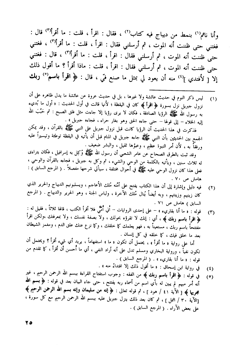 [ (1) ] ليس ذكر النوم في حديث عائشة ولا غيرها، بل في حديث عروة عن عائشة ما يدل ظاهره على أن نزول جبريل نزل بسورة اقْرَأْ كان في اليقظة، لأنها قالت في أول الحديث: «أول ما بدئ به رسول اللَّه صلّى اللَّه عليه وسلّم الرؤيا الصادقة، فكان لا يرى رؤيا إلا جاءت مثل فلق الصبح: ثم حبّب اللَّه إليه الخلاء- إلى قولها- حتى جاءه الحق وهو بغار حراء، فجاءه جبريل» .