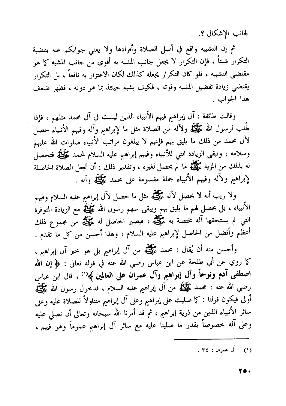 وقالت طائفة: آل إبراهيم فيهم الأنبياء الذين ليست في آل محمد مثلهم، فإذا طلب لرسول اللَّه صلى اللَّه عليه وسلّم ولآله من الصلاة مثل ما لإبراهيم وآله وفيهم الأنبياء حصل لآل محمد من ذلك ما يليق بهم فإنّهم لا يبلغون مراتب الأنبياء صلوات اللَّه عليهم وسلامه، وتبقى الزيادة التي للأنبياء وفيهم إبراهيم عليه السلام لمحمد صلى اللَّه عليه وسلّم فتحصل له بذلك من المزية صلى اللَّه عليه وسلّم ما لم يحصل لغيره، وتقدير ذلك: أن تجعل الصلاة الحاصلة لإبراهيم ولآله وفيهم الأنبياء جملة مقسومة على محمد صلى اللَّه عليه وسلّم وآله.