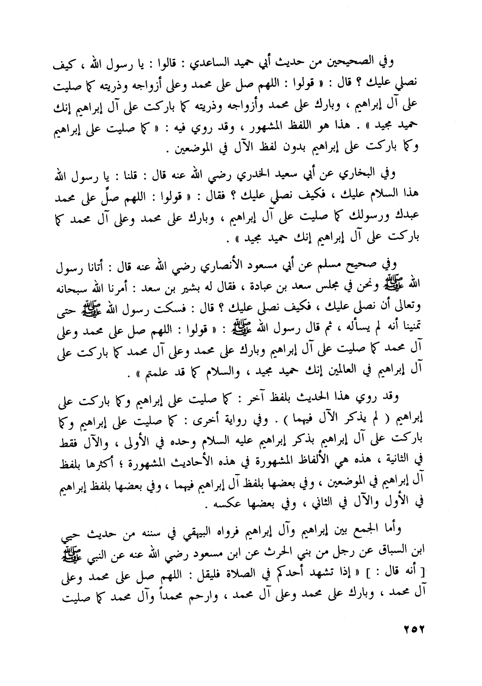 وفي الصحيحين من حديث أبي حميد الساعدي: قالوا: يا رسول اللَّه، كيف نصلي عليك؟ قال: «قولوا: اللَّهمّ صل على محمد وعلى أزواجه وذريته كما صليت على آل إبراهيم، وبارك على محمد وأزواجه وذريته كما باركت على آل إبراهيم إنك حميد مجيد» . هذا هو اللفظ المشهور، وقد روي فيه: «كما صليت على إبراهيم وكما باركت على إبراهيم