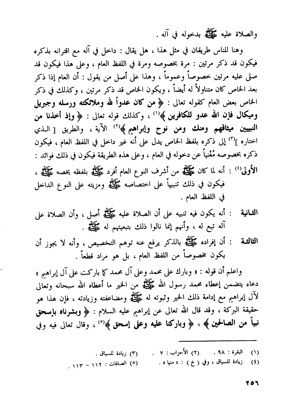 وهنا للناس طريقان في مثل هذا، هل يقال: داخل في آله مع اقترانه بذكره فيكون قد ذكر مرتين: مرة بخصوصه ومرة في اللفظ العام، وعلى هذا فيكون قد صلى عليه مرتين خصوصا وعموما، وهذا على أصل من يقول: أن العام إذا ذكر بعد الخاص كان متناولا له أيضا، ويكون الخاص قد ذكر مرتين، وكذلك في ذكر الخاص بعض العام كقوله تعالى: مَنْ كانَ عَدُوًّا لِلَّهِ وَمَلائِكَتِهِ وَرُسُلِهِ وَجِبْرِيلَ وَمِيكالَ فَإِنَّ اللَّهَ عَدُوٌّ لِلْكافِرِينَ [ (1) ] ، وكذلك قوله تعالى: وَإِذْ أَخَذْنا مِنَ النَّبِيِّينَ مِيثاقَهُمْ وَمِنْكَ وَمِنْ نُوحٍ وَإِبْراهِيمَ [ (2) ] الآية، والطريق [الّذي اختاره] [ (3) ] إلى ذكره بلفظ الخاص يدل على أنه غير داخل في اللفظ العام، فيكون ذكره بخصوصه مغنيا عن دخوله في العام، وعلى هذه الطريقة فيكون في ذلك فوائد: