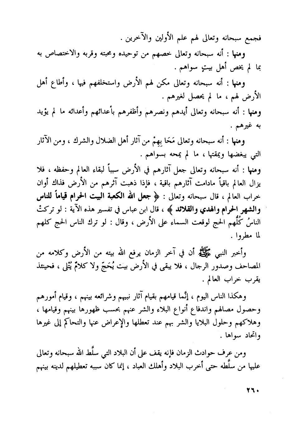ومنها: أنه سبحانه وتعالى جعل آثارهم في الأرض سببا لبقاء العالم وحفظه، فلا يزال العالم باقيا ما دامت آثارهم باقية، فإذا ذهبت آثرهم من الأرض فذاك أوان خراب العالم، قال سبحانه وتعالى: جَعَلَ اللَّهُ الْكَعْبَةَ الْبَيْتَ الْحَرامَ قِياماً لِلنَّاسِ وَالشَّهْرَ الْحَرامَ وَالْهَدْيَ وَالْقَلائِدَ، قال ابن عباس في تفسير هذه الآية: لو تركت الناس كلّهم الحج لوقعت السماء على الأرض، وقال: لو ترك الناس الحج كلهم لما مطروا.