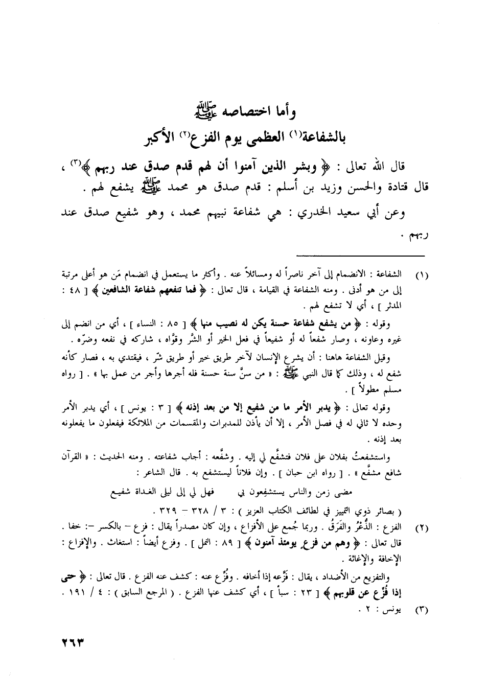 وأما اختصاصه صلى اللَّه عليه وسلّم بالشفاعة [ (1) ] العظمى يوم الفزع [ (2) ] الأكبر