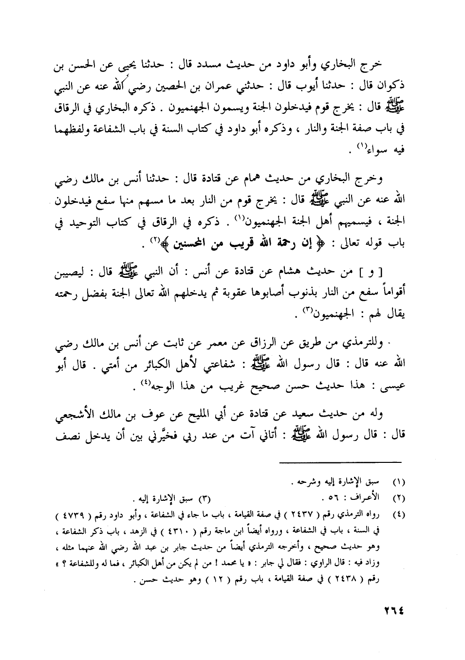[ (4) ] رواه الترمذي رقم (2437) في صفة القيامة، باب ما جاء في الشفاعة، وأبو داود رقم (4739) في السنة، باب في الشفاعة، ورواه أيضا ابن ماجة رقم (4310) في الزهد، باب ذكر الشفاعة، وهو حديث صحيح، وأخرجه الترمذي أيضا من حديث جابر بن عبد اللَّه رضي اللَّه عنهما مثله، وزاد فيه: قال الراويّ: فقال لي جابر: «يا محمد! من لم يكن من أهل الكبائر، فما له وللشفاعة؟» رقم (2438) في صفة القيامة، باب رقم (12) وهو حديث حسن.