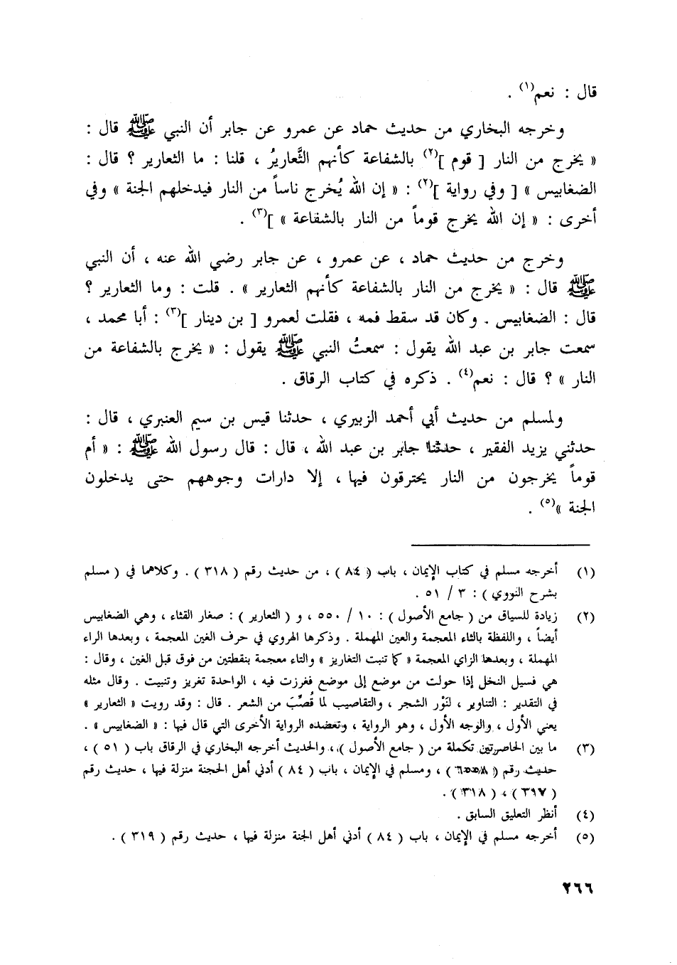 وخرجه البخاري من حديث حماد عن عمرو عن جابر أن النبي صلى اللَّه عليه وسلّم قال: «يخرج من النار [قوم] [ (2) ] بالشفاعة كأنهم الثّعارير، قلنا: ما الثعارير؟ قال: