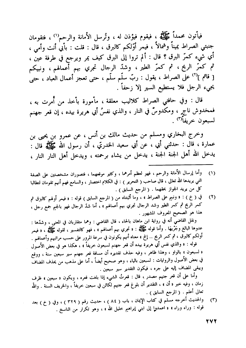 [ (2) ] في (خ) : «ونبيم على الصراط» ، وما أثبتناه من (المرجع السابق) قوله: «فيمر أولهم كالبرق ثم كمر الريح ثم كمر الطير وشد الرجال تجري بهم أعمالهم» ، أما شدّ الرجال فهو بالجيم جمع رجل، هذا هو الصحيح المعروف المشهور.