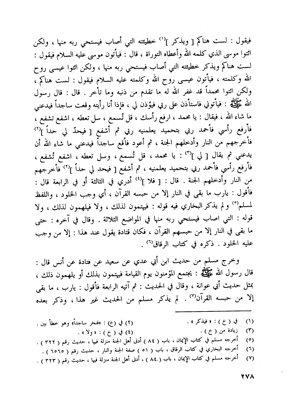 فأقول: يا رب ما بقي في النار إلا من حبسه القرآن، أي وجب الخلود، واللفظ لمسلم [ (5) ] ولم يذكر البخاري فيه قوله: فيهتمون لذلك، ولا فيلهمون لذلك، ولا قوله: التي أصاب فيستحي ربه منها في المواضع الثلاثة. وقال في آخره: حتى ما بقي في النار إلا من حبسهم القرآن، فكان قتادة يقول عند هذا: إلا من وجب عليه الخلود. ذكره في كتاب الرقاق [ (6) ] .