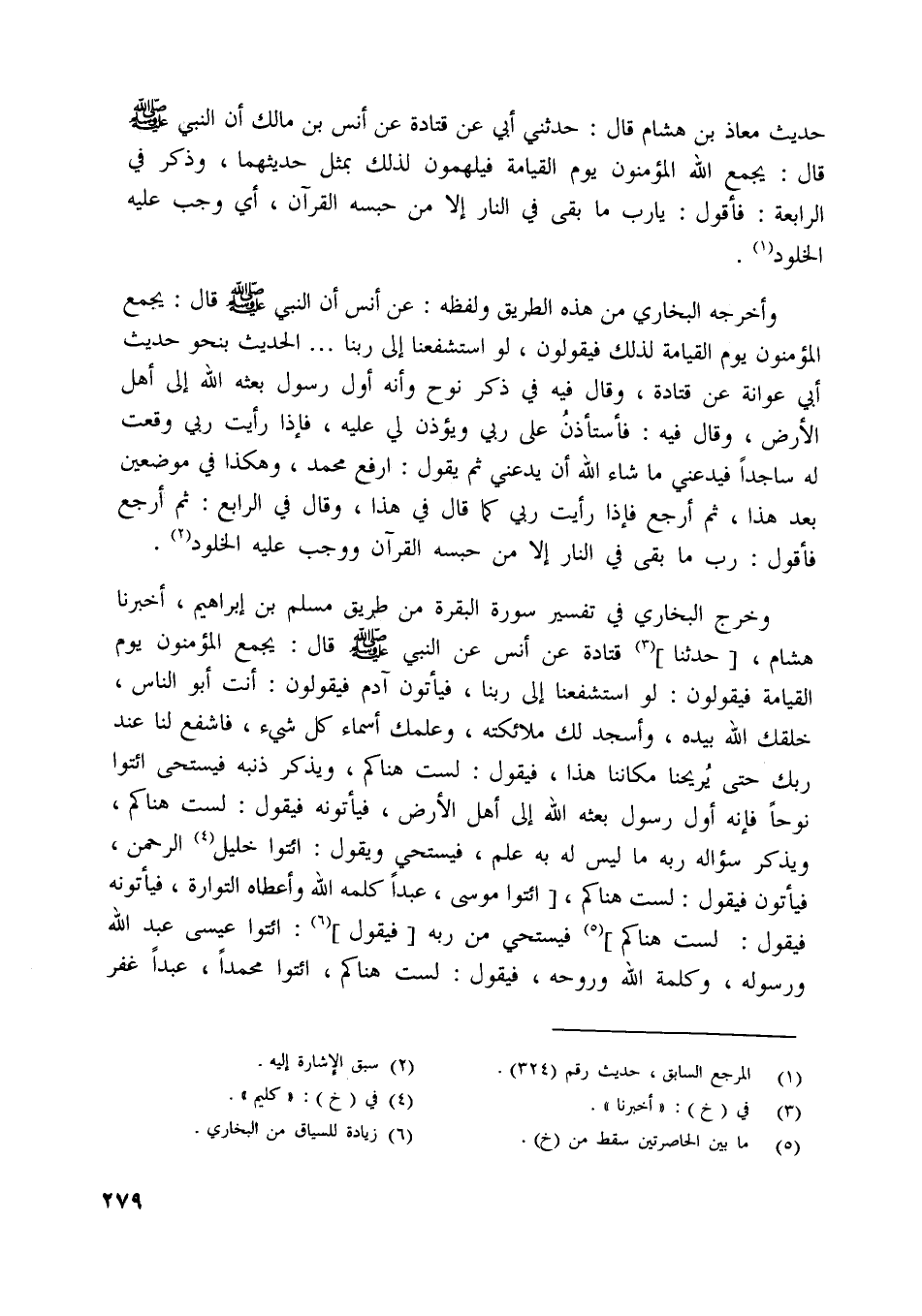 حديث معاذ بن هشام قال: حدثني أبي عن قتادة عن أنس بن مالك أن النبي صلى اللَّه عليه وسلّم قال: يجمع اللَّه المؤمنون يوم القيامة فيلهمون لذلك بمثل حديثهما، وذكر في الرابعة: فأقول: يا رب ما بقي في النار إلا من حبسه القرآن، أي وجب عليه الخلود [ (1) ] .